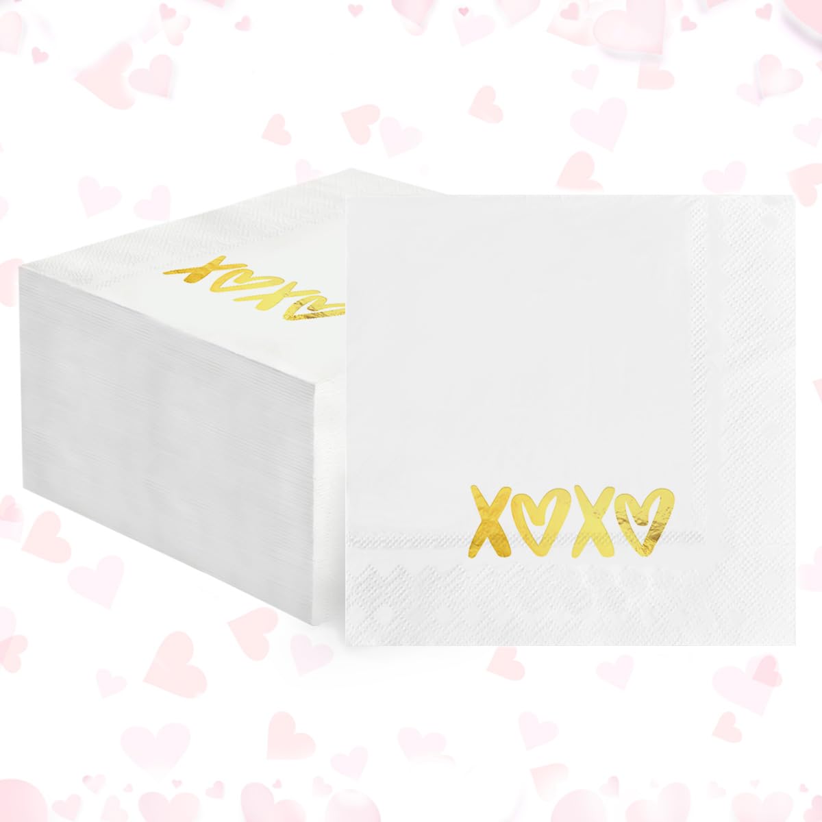 Horaldaily 50 Valentine Disposable Paper Decorative Guest Napkins, Xoxo Golden Foil Heart Hand Towel For Party Lunch Dinner Kitc
