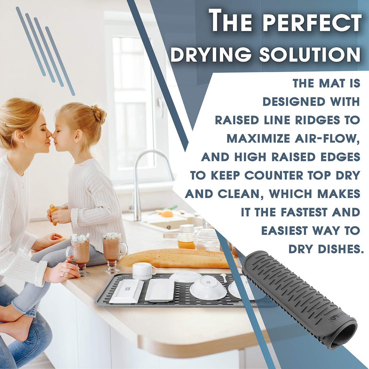 - Q: What are the key features of the HOTPOP Silicone Dish Drying Mat? A: Key features include raised line ridges for airflow, high raised edges to keep countertops dry, non-slip design, and shock-absorbency.