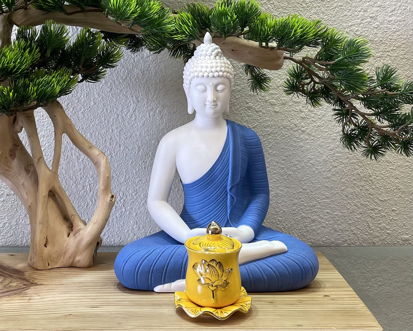 • Q: How is the altar cup designed? A: The altar cup features a beautiful golden painted lotus flower pattern, which represents wisdom and enlightenment in Buddhism.