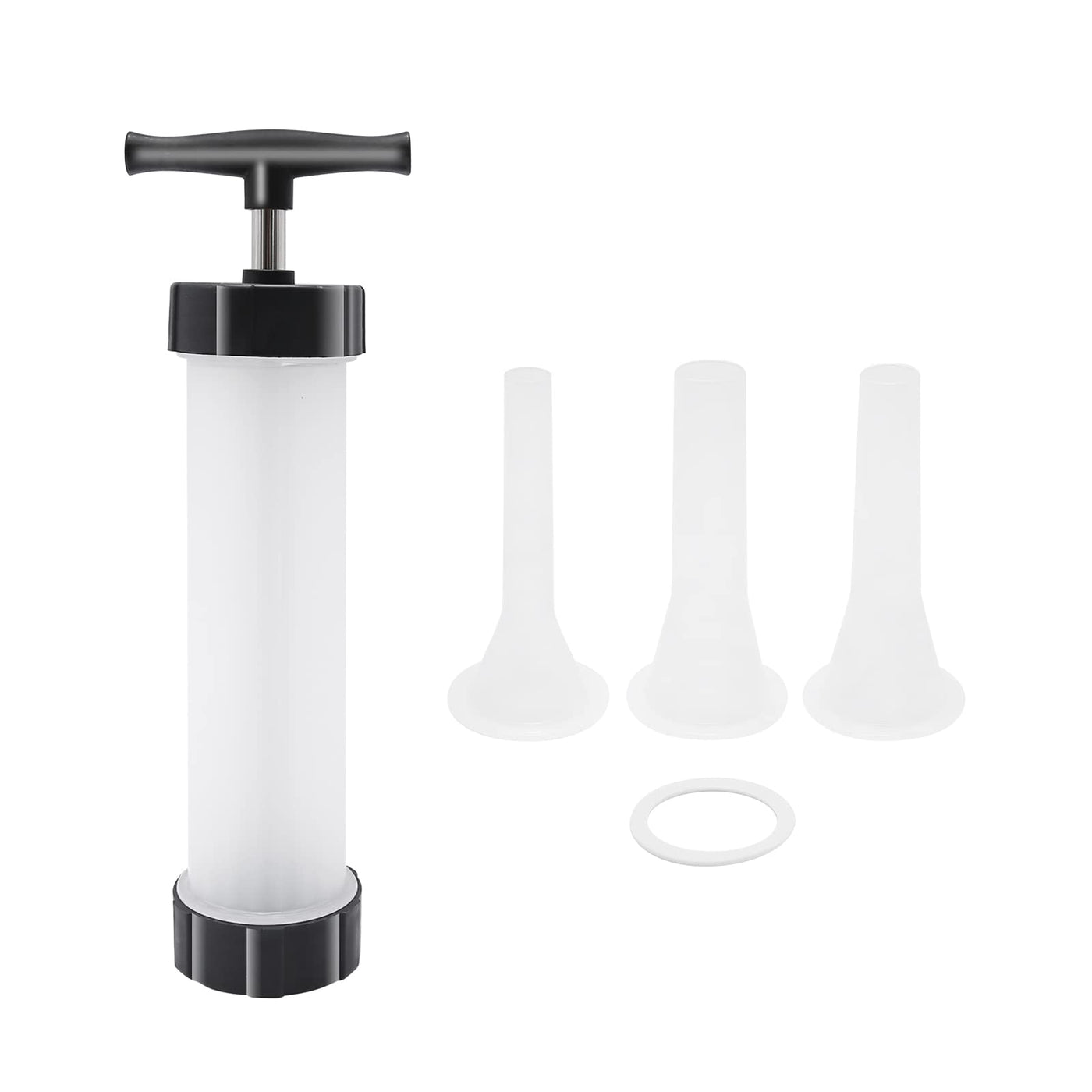 - Q: What is included in the package? A: The package includes one manual sausage stuffer barrel and three stuffing tubes of different sizes.