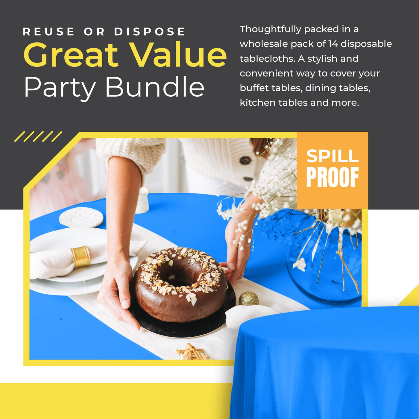 - Q: How many tablecloths are included in the pack? A: Each pack includes 14 disposable tablecloths, providing great value for parties and events.