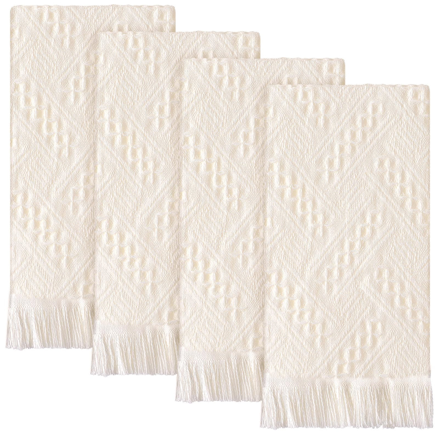 Features: These Turkish style towels are good absorbent, quickly absorbing water stains and perspiration for a dry experience and long life. Convenient for daily use, easy to carry and less burden on the body. This bohemian hand towel, it is made from a reliable cotton material. It is a daily product for bathroom or kitchen. This boho hand towel is made of a cotton polyester blend for good absorbency, softness and durability. Specifications: Material: cotton Color: beige Size: 14 x 30 inches Style: bohemian style Package includes: 4 x cream white turkish hand towels Notes: Manual measurement, please allow slight errors on size. The color may exist a slight difference due to different screen displays.