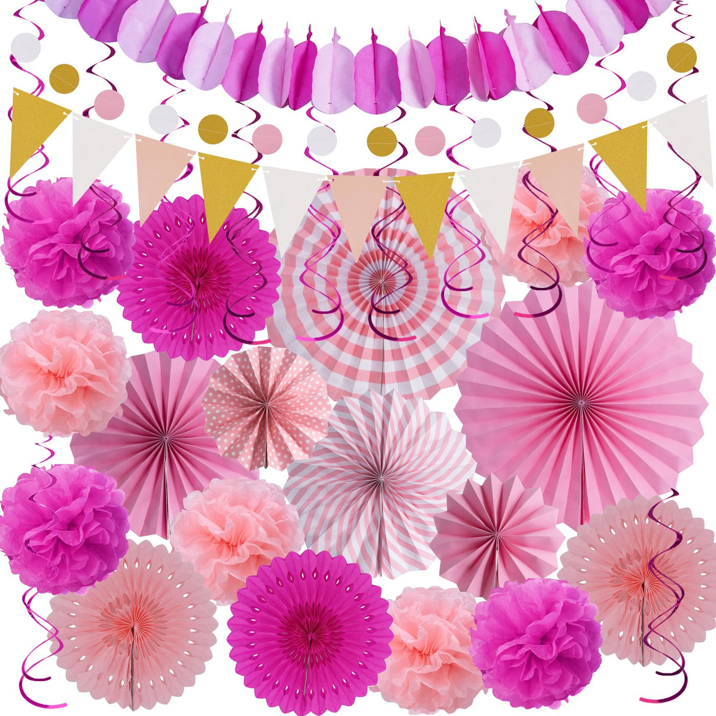 Huryfox Pink Party Decorations - 33pcs Hanging Paper Fans, Rainbow Paper Pom Poms, Fiesta Bunting and Tissue Streamers for Birth