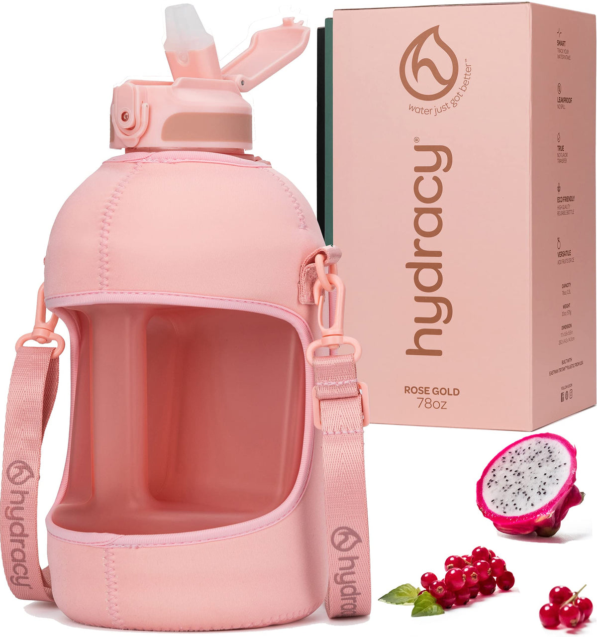 Hydracy Water Bottle with Storage Sleeve and Straw - Large Half gallon BPA Free Motivational Jug with Time Marker - Leak Proof gym Bottle - Ideal gift for Fitness or Sports & Outdoors ( Rose gold Straw 78oz)