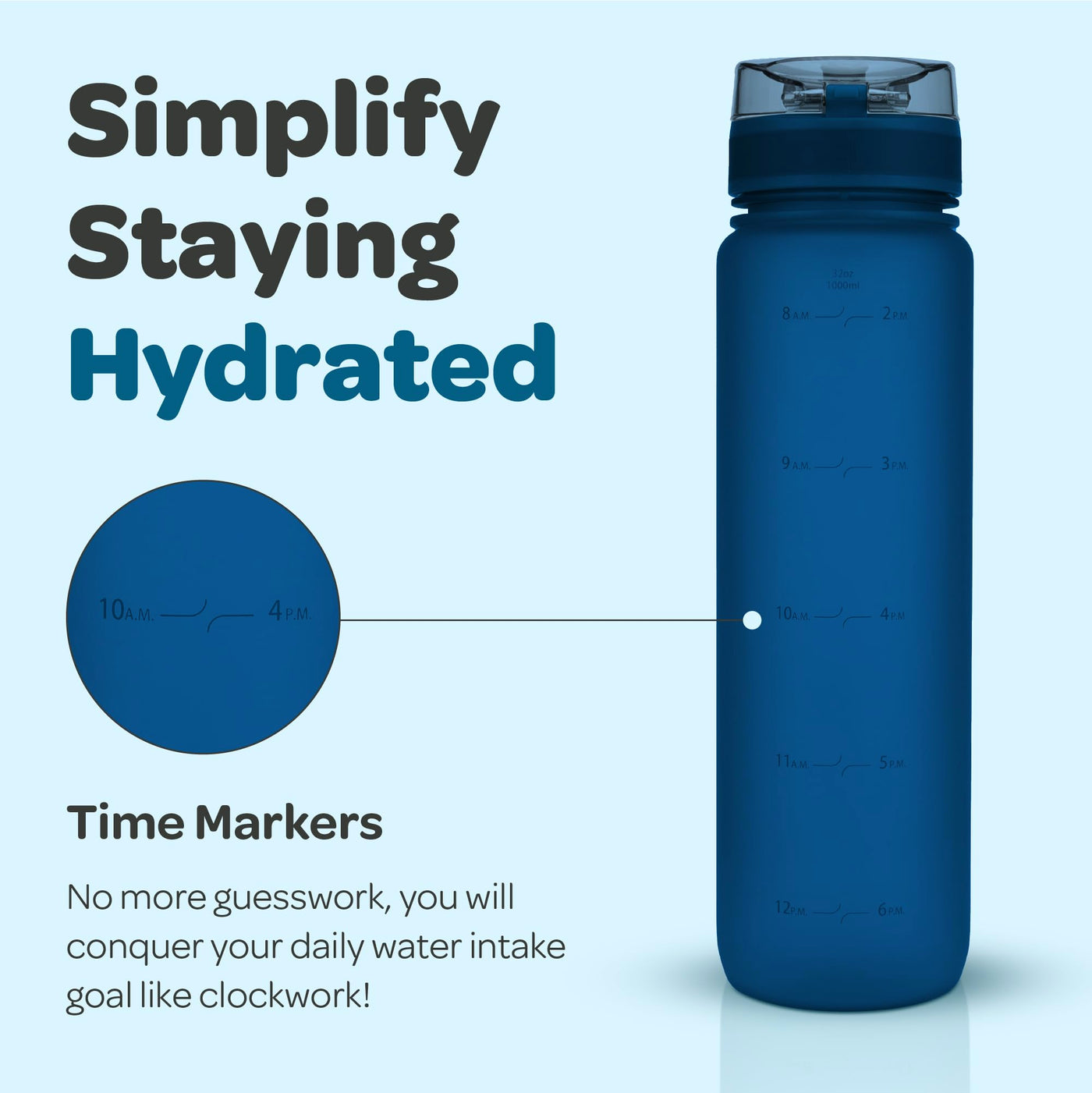 - Q: Does the bottle have a time marker feature? A: Yes, this water bottle includes hourly measurements to help motivate you to drink water consistently throughout the day.