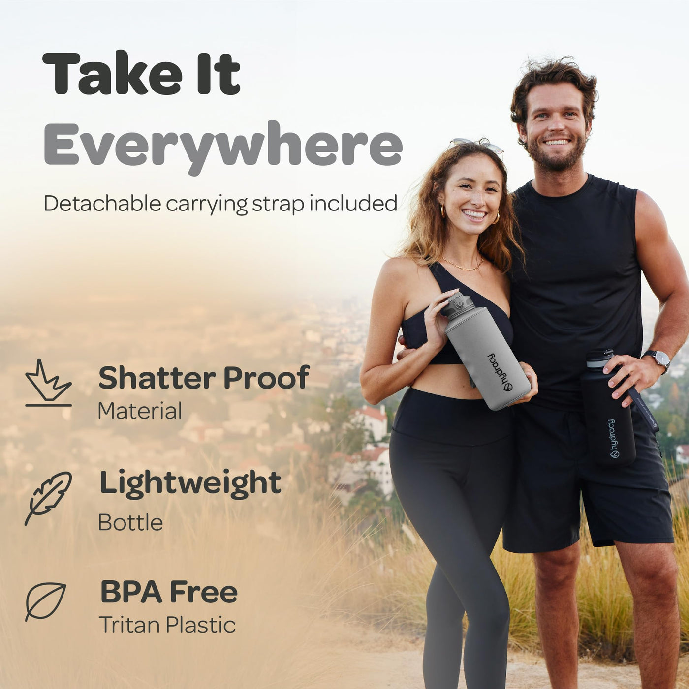 - Q: What materials are used in the Hydracy Water Bottle? A: The bottle is made from durable Tritan plastic and includes a neoprene sleeve for added insulation and protection.