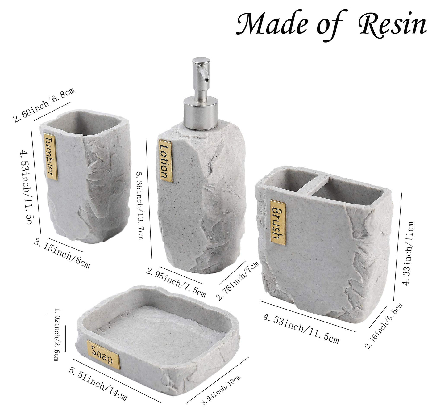 • Q: How many pieces are included in the set? A: The set includes four essential pieces: a toothbrush cup, soap dispenser, soap dish, and tumbler.
