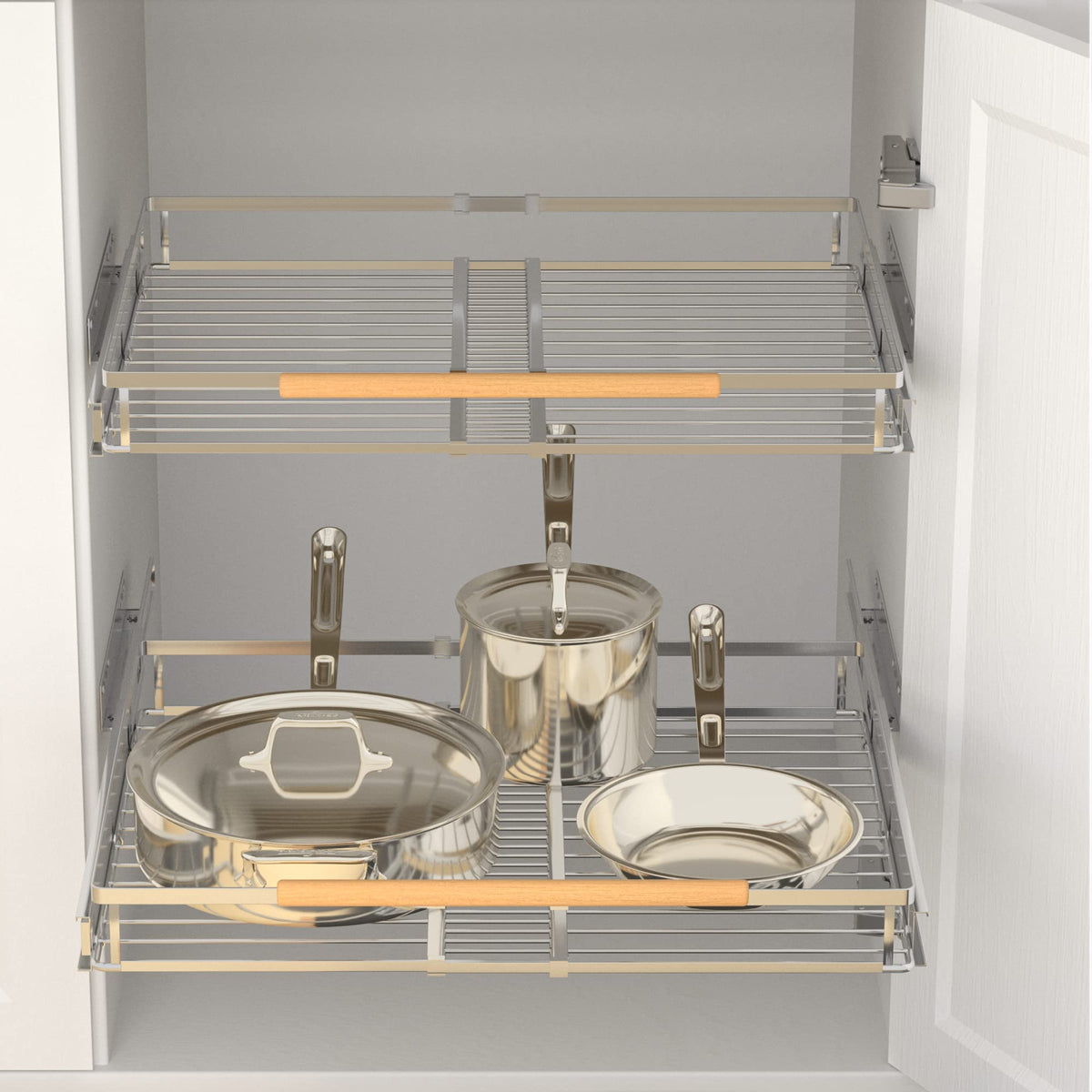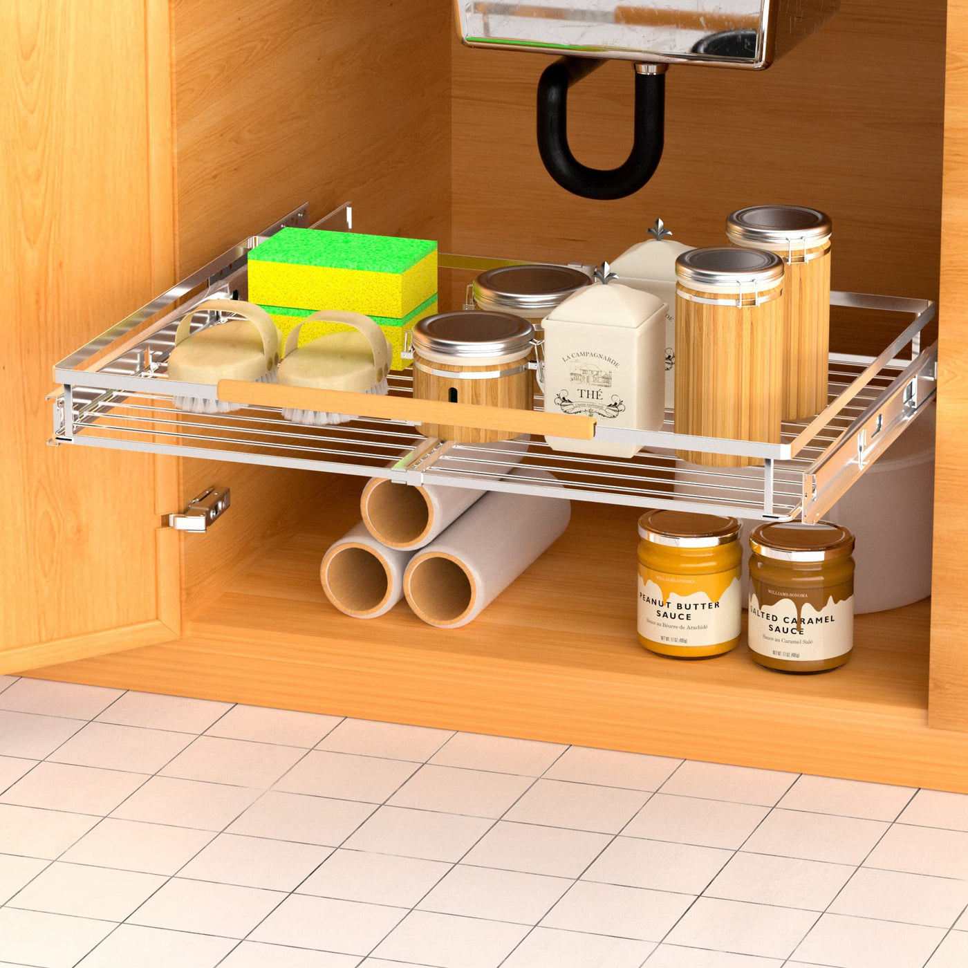 - Q: What can I store in this cabinet organizer? A: It is ideal for storing stand mixers, pots, pans, baking sheets, and various kitchen accessories, as well as cleaning supplies.