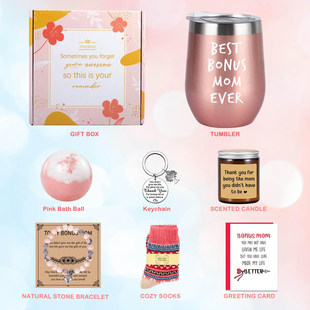 - Q: What items are included in the Ithmahco Bonus Mom Gift Basket? A: The Ithmahco Bonus Mom Gift Basket includes a 'Best Bonus Mom Ever' tumbler, a 'Thank You for Loving Me as Your Own' keychain, soft socks, a 'Thank You for Being My Mom' candle, a 'To My Bonus Mom' bracelet, a heartfelt card, and a pink bath ball.