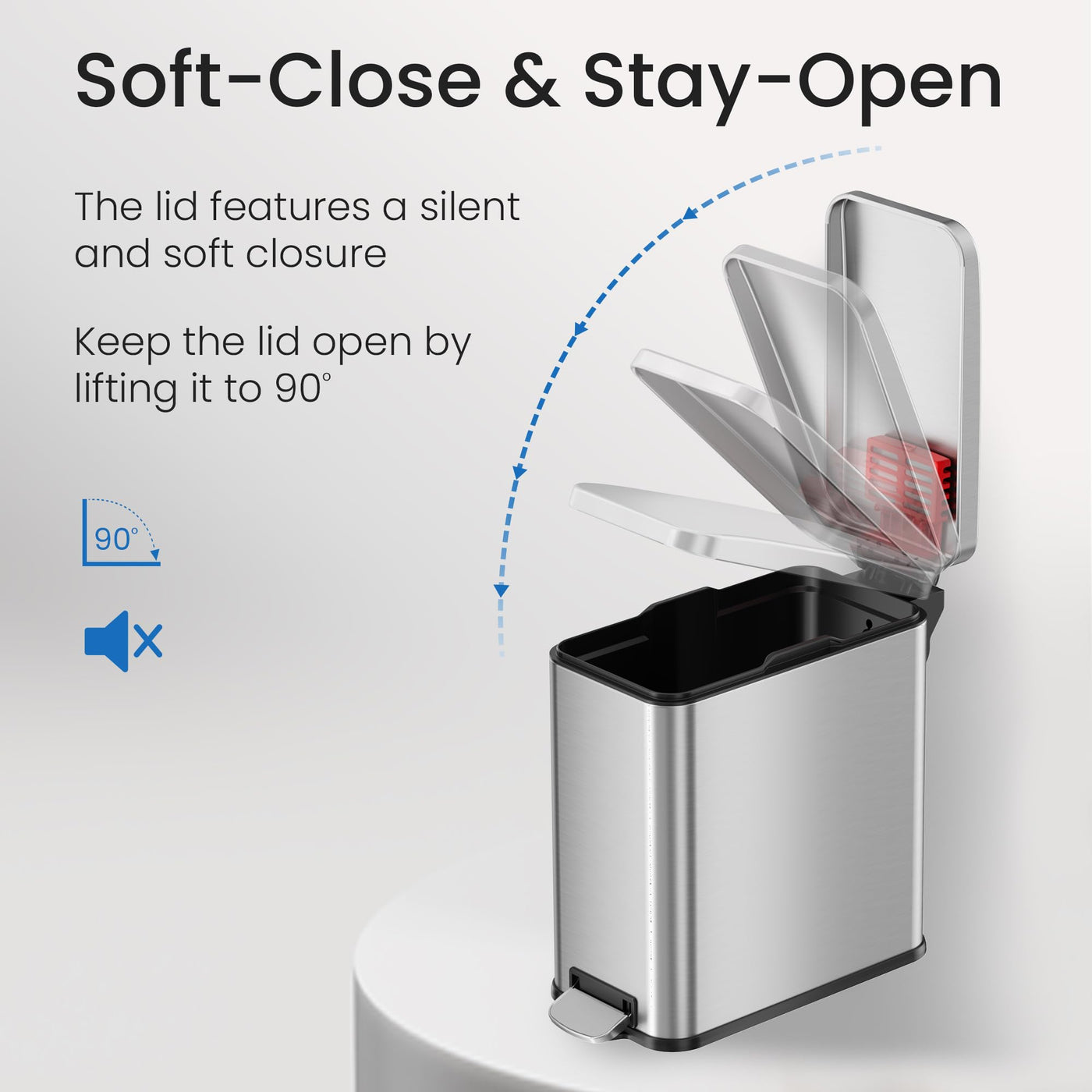 - Q: Is the trash can easy to open and close? A: Yes, the trash can features a durable, ergonomic pedal that requires minimal force to operate, and it has a gentle and silent lid close mechanism for a smooth user experience.