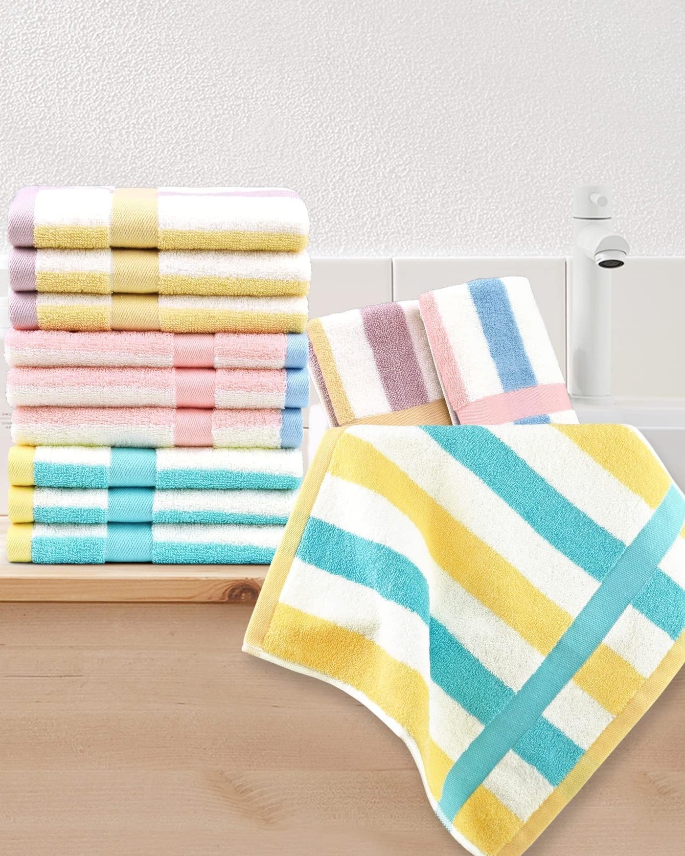 - Q: What colors are available in the pack? A: The pack includes striped washcloths in Blue & Peach-Pink, Lilac & Khaki, and Teal & Light Yellow.