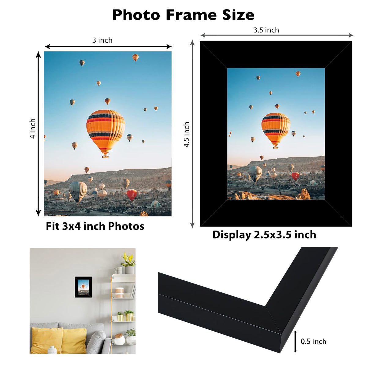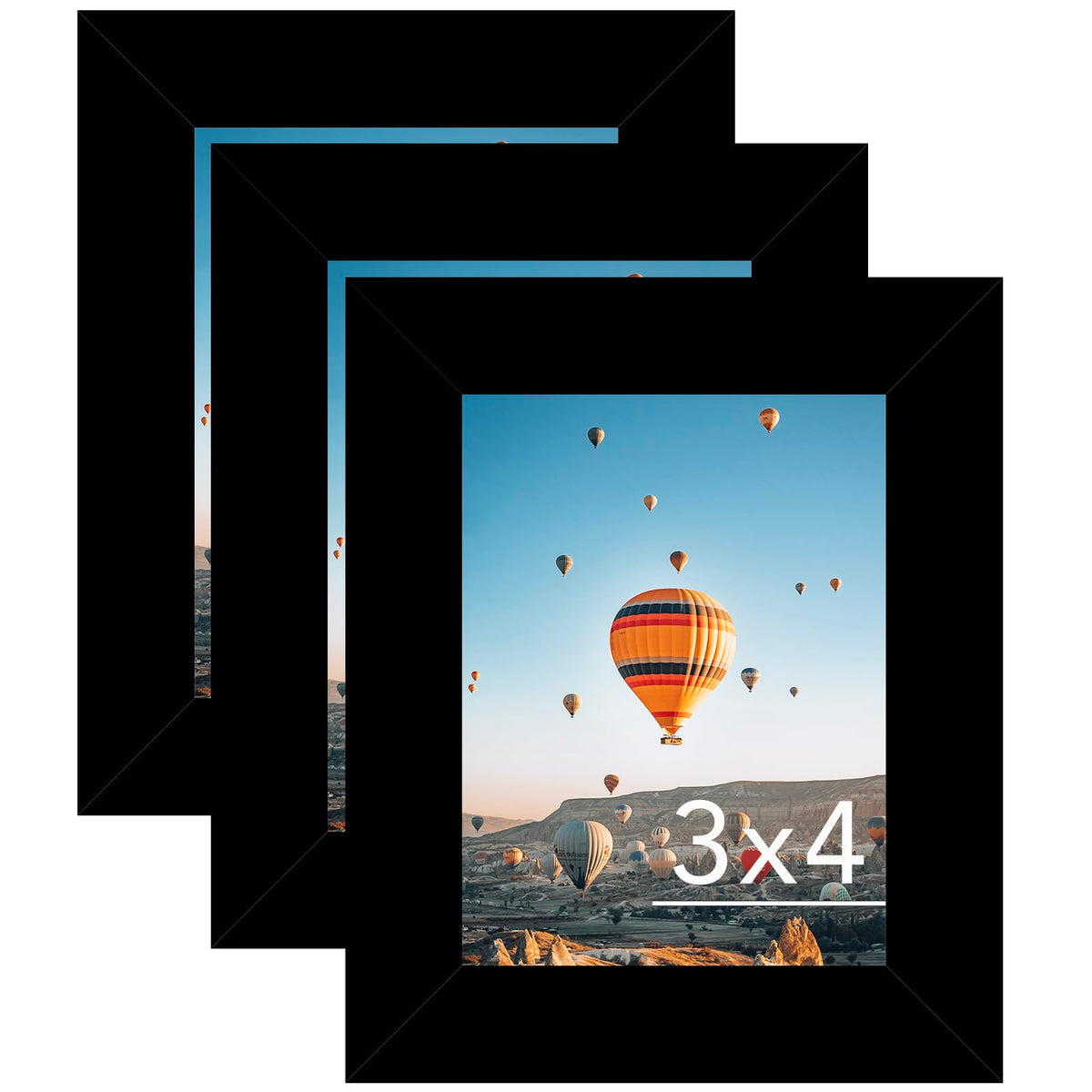 Package Includes: 3 pcs 3x4 black picture frames. FRAME SIZE: The black picture frame fits 3x4 pictures artwork prints and photos, simple and stylish, the frame opening display will be 0.5 inches smaller than the photo to better hold the photo instead of a defect.