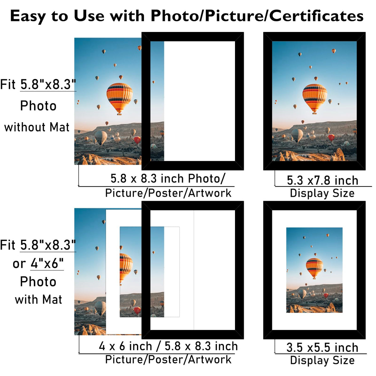 Package Includes: 4 pack A5 5.8x8.3 black picture frames with mat for A5 / 5.8 x 8.3 photos prints posters canvas without mat and 4x6 pictures with mat. FRAME SIZE: The black picture frame fits A5 / 5.8x8.3 inch photos prints canvas posters without mat and 4x6 inch pictures with mat, simple and stylish, the frame opening display will be 0.5 inches smaller than the photo to better hold the photo instead of a defect.