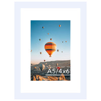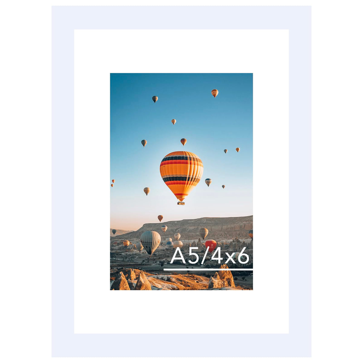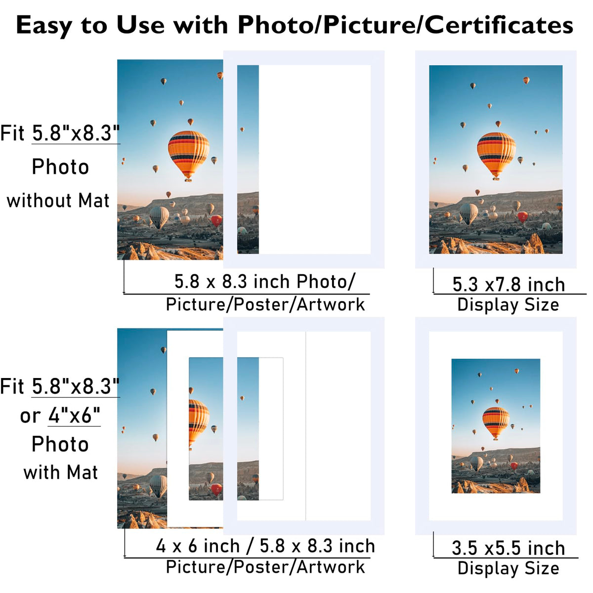 FRAME SIZE: The white picture frame fits A5 / 5.8x8.3 inch photos prints canvas posters without mat and 4x6 inch pictures with mat, simple and stylish, the frame opening display will be 0.5 inches smaller than the photo to better hold the photo instead of a defect.
