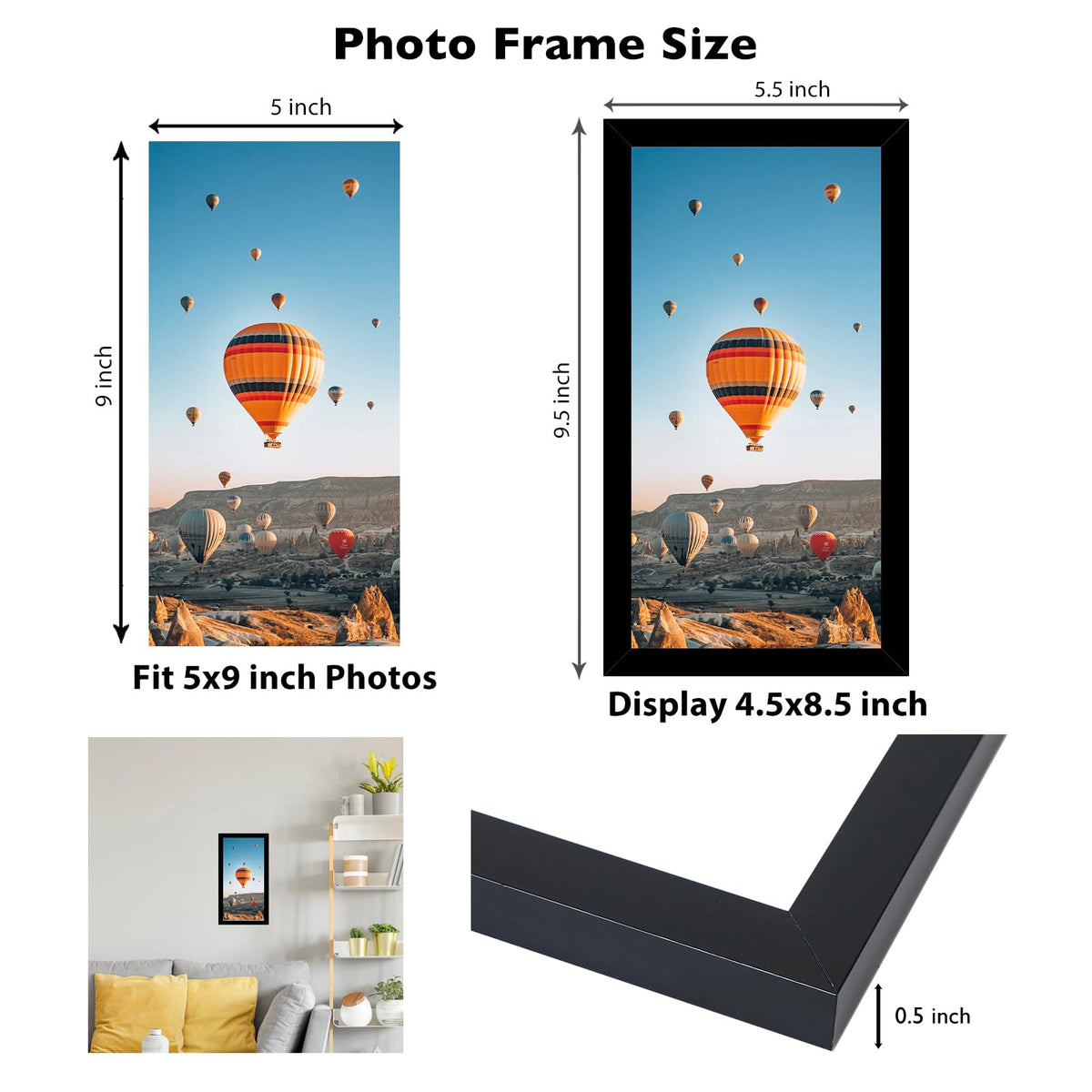 FRAME SIZE: The black picture frame fits 5x9 photos pictures artworks posters and prints, simple and stylish, the frame opening display will be 0.5 inches smaller than the photo to better hold the photo instead of a defect.