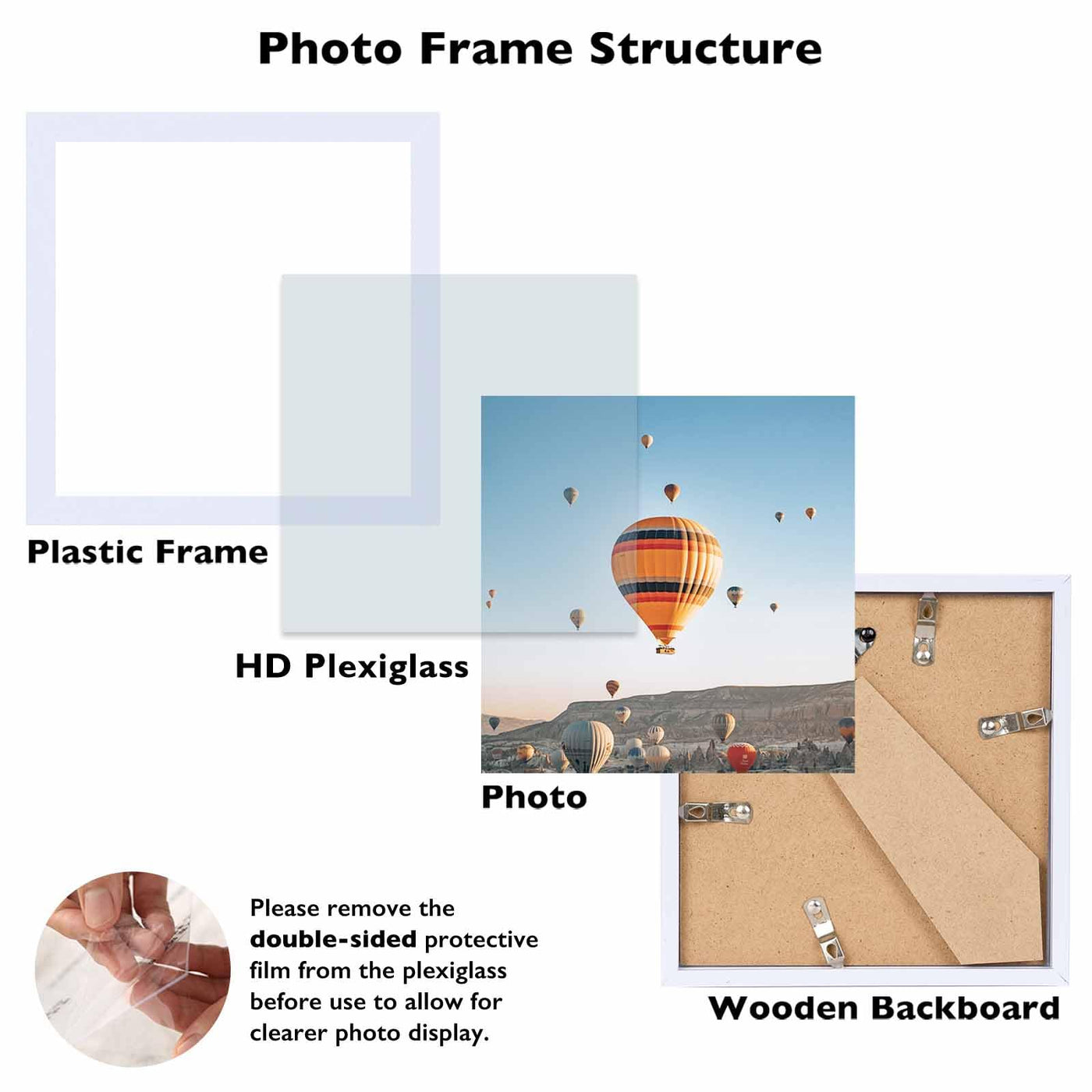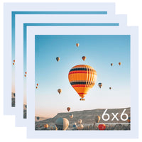 Package Includes: 3 pack 6x6 white picture frames. FRAME SIZE: The white picture frame fits 6x6 photos, simple and stylish, the frame opening display will be 0.5 inches smaller than the photo to better hold the photo instead of a defect.