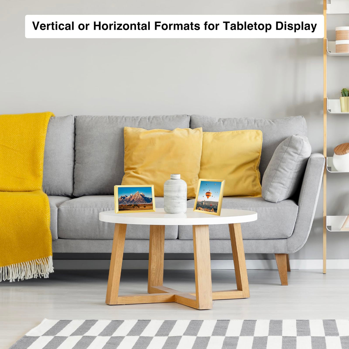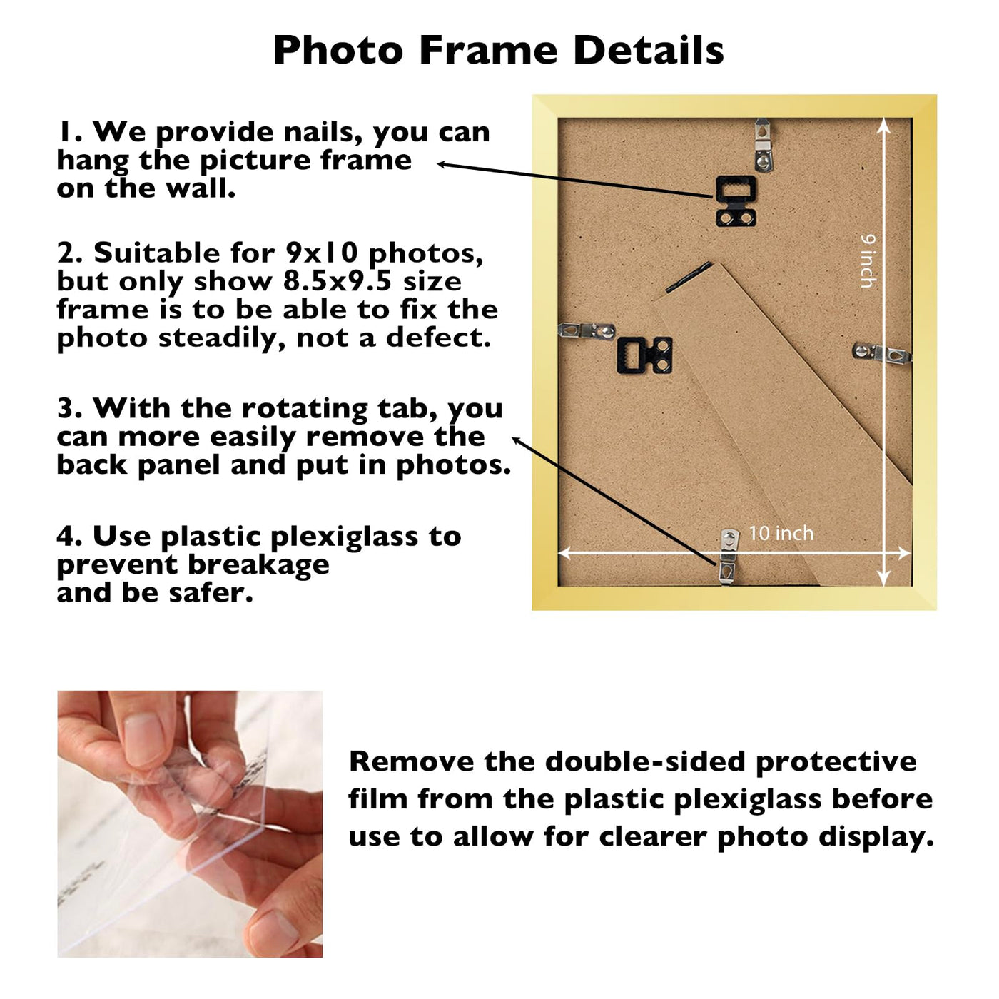FRAME SIZE: The gold picture frame fits 9x10 photos pictures artworks posters and prints, simple and stylish, the frame opening display will be 0.5 inches smaller than the photo to better hold the photo instead of a defect.