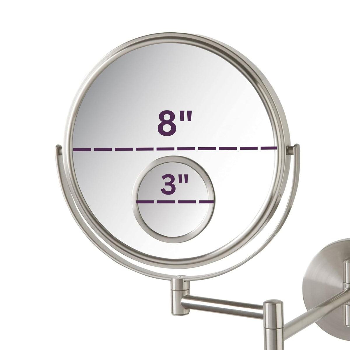 • Q: What is the diameter of the mirror? A: The diameter of the JERDON Wall Mount Mirror is 8 inches, providing a good viewing area for makeup application and grooming.