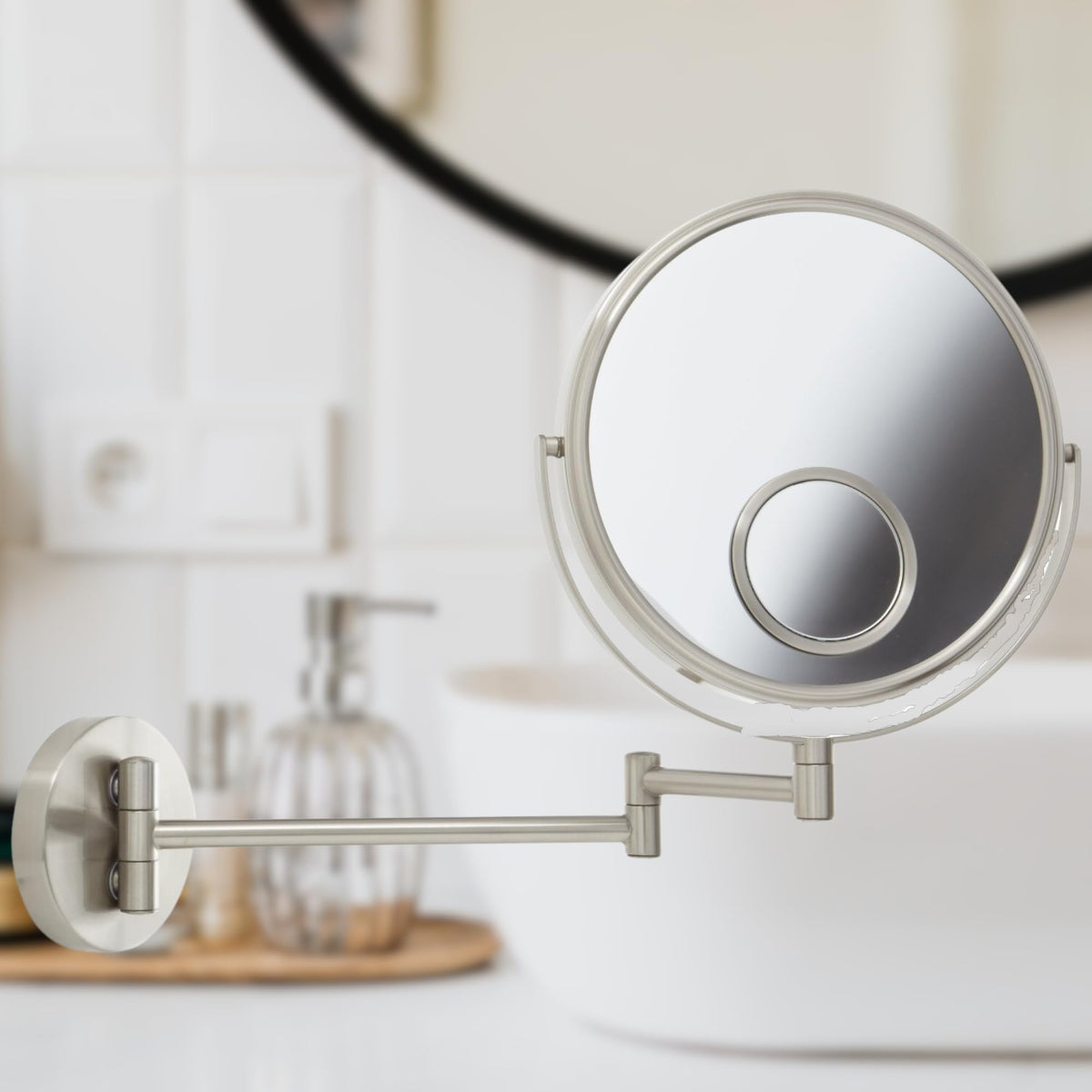 • Q: How far does the extendable arm reach? A: The extendable arm of the JERDON Wall Mount Mirror can extend up to 10 inches from the wall, allowing for flexible positioning.