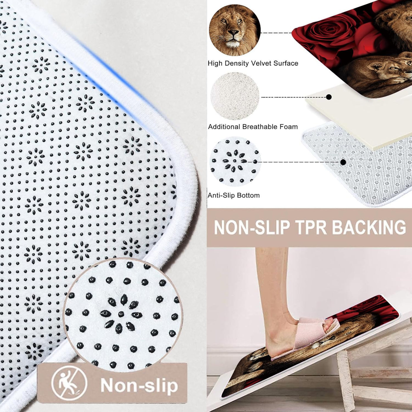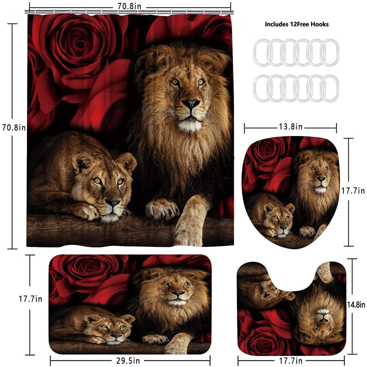Jieprom 4Pcs Red Rose And Lion Shower Curtain Bathroom Set With Rugs, Toilet Lid Cover And Bath Mat, Red Shower Curtain With 12