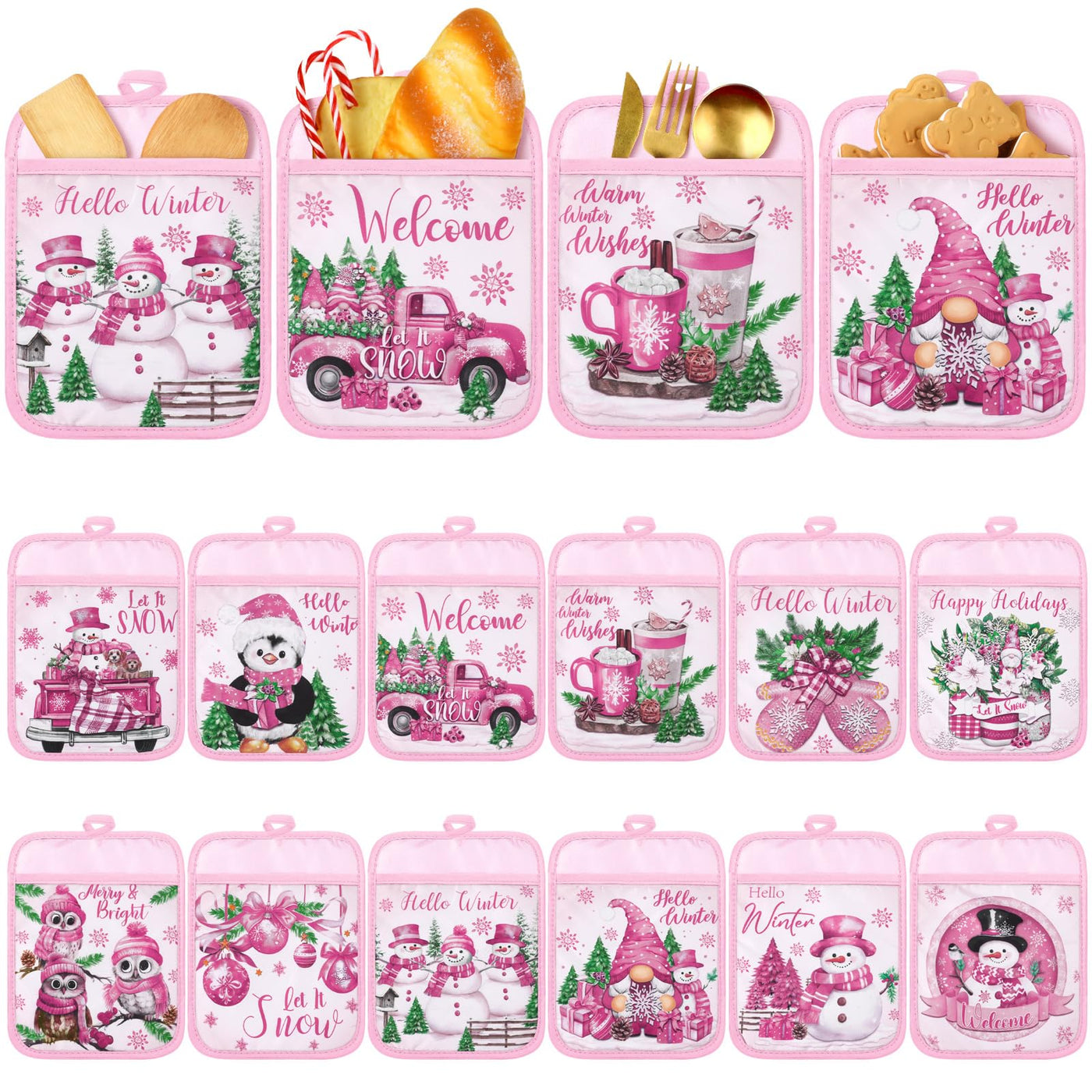 Jingmore 12 Pcs Pink Christmas Pot Holders with Pocket Hello Winter Pot Holders Gift Bulk Snowman Gnome Heat Resistant Hot Pads