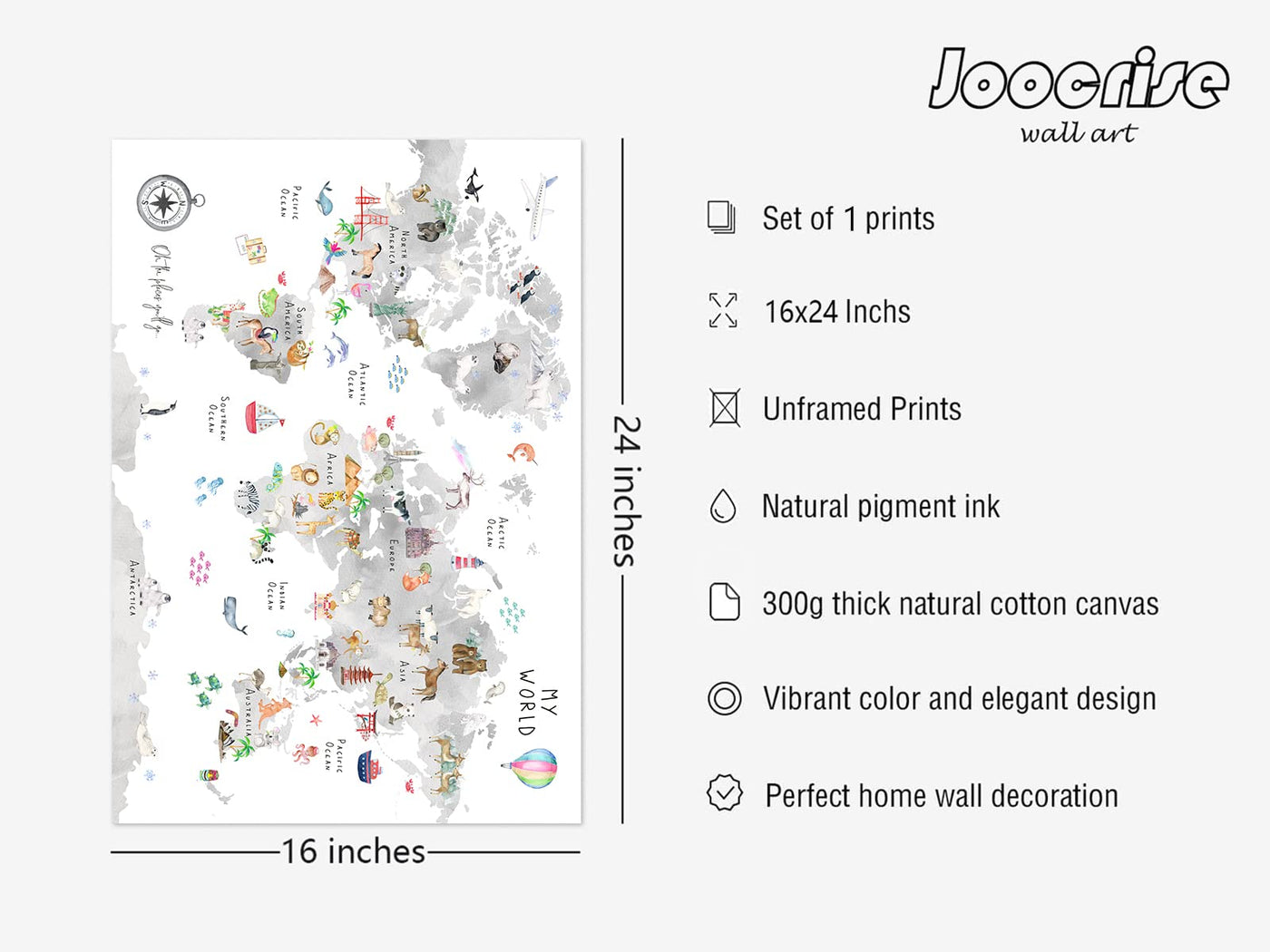 - Q: What size is the Joocrise Kids World Map Canvas Wall Art? A: The Joocrise Kids World Map Canvas Wall Art is available in a size of 16x24 inches and is unframed.