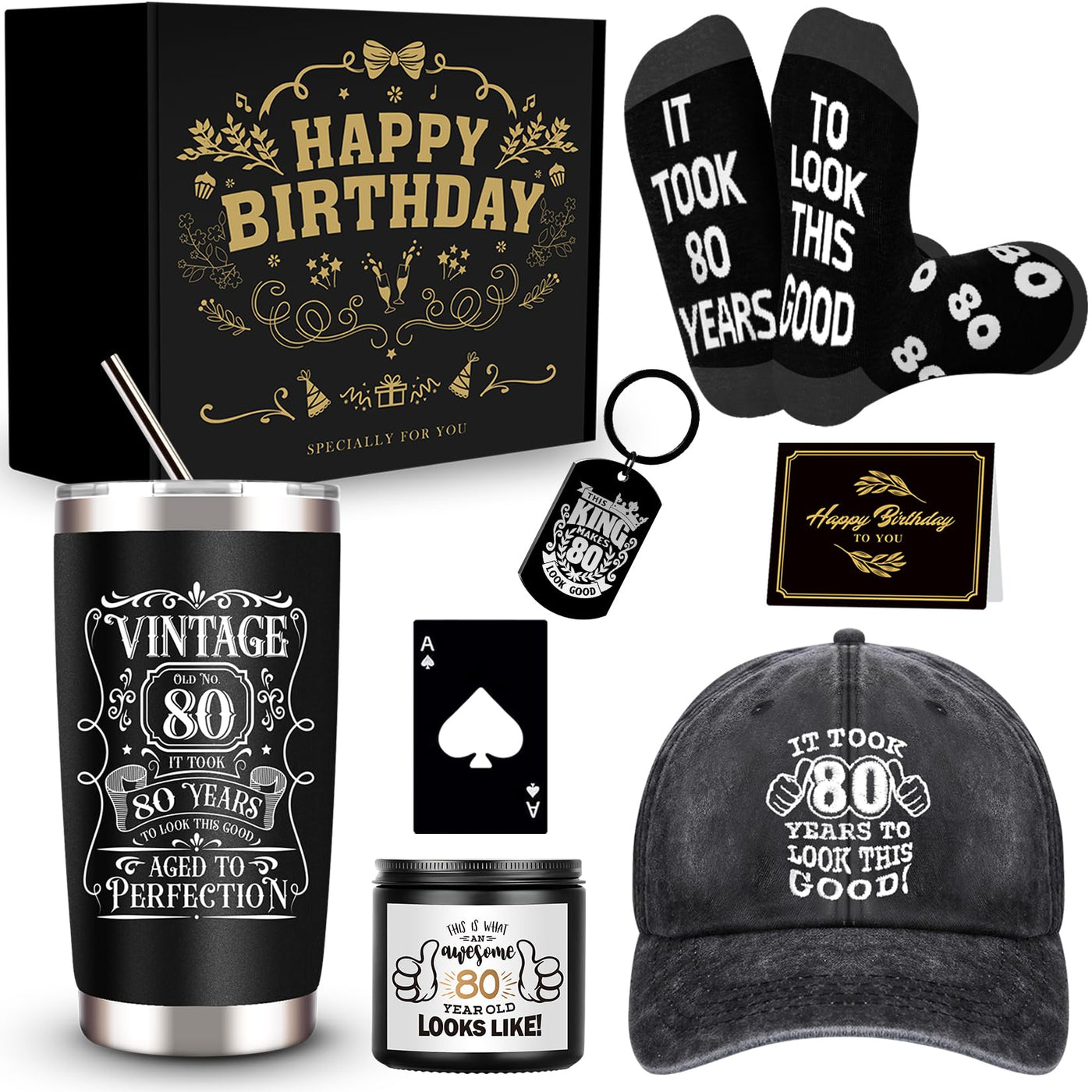 JTAMOHI 80th Birthday Gifts for Men, Unique 80 Year Old Birthday Gifts Box with 20 Oz Tumbler, Scented Candle, Socks, Baseball C