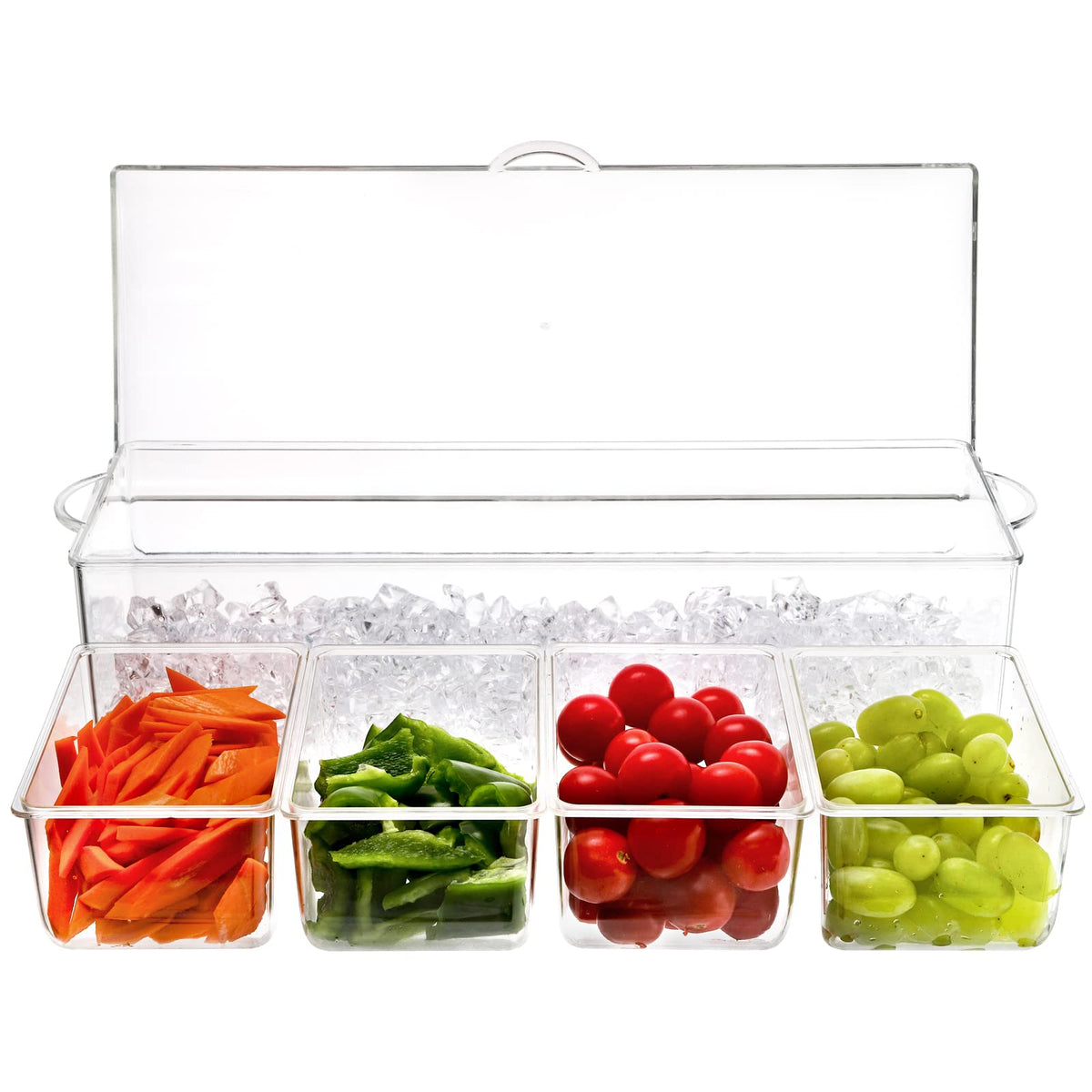 Jucoan Large Ice Chilled Condiment Server With Lid And 4 Removable Compartment, Clear Plastic Condiment Server Caddy Tray On Ice