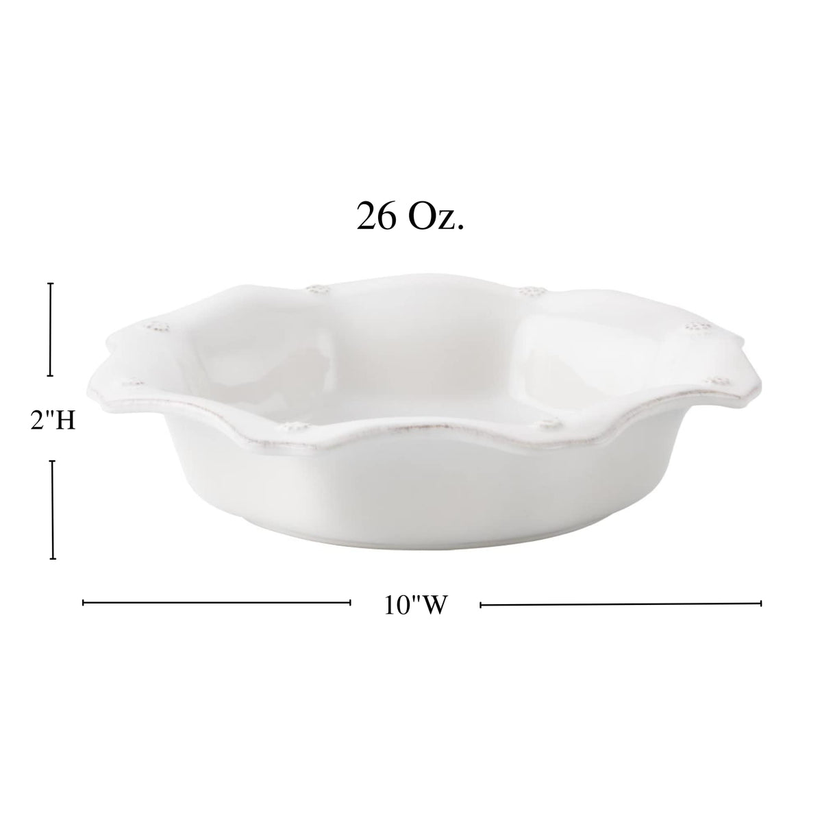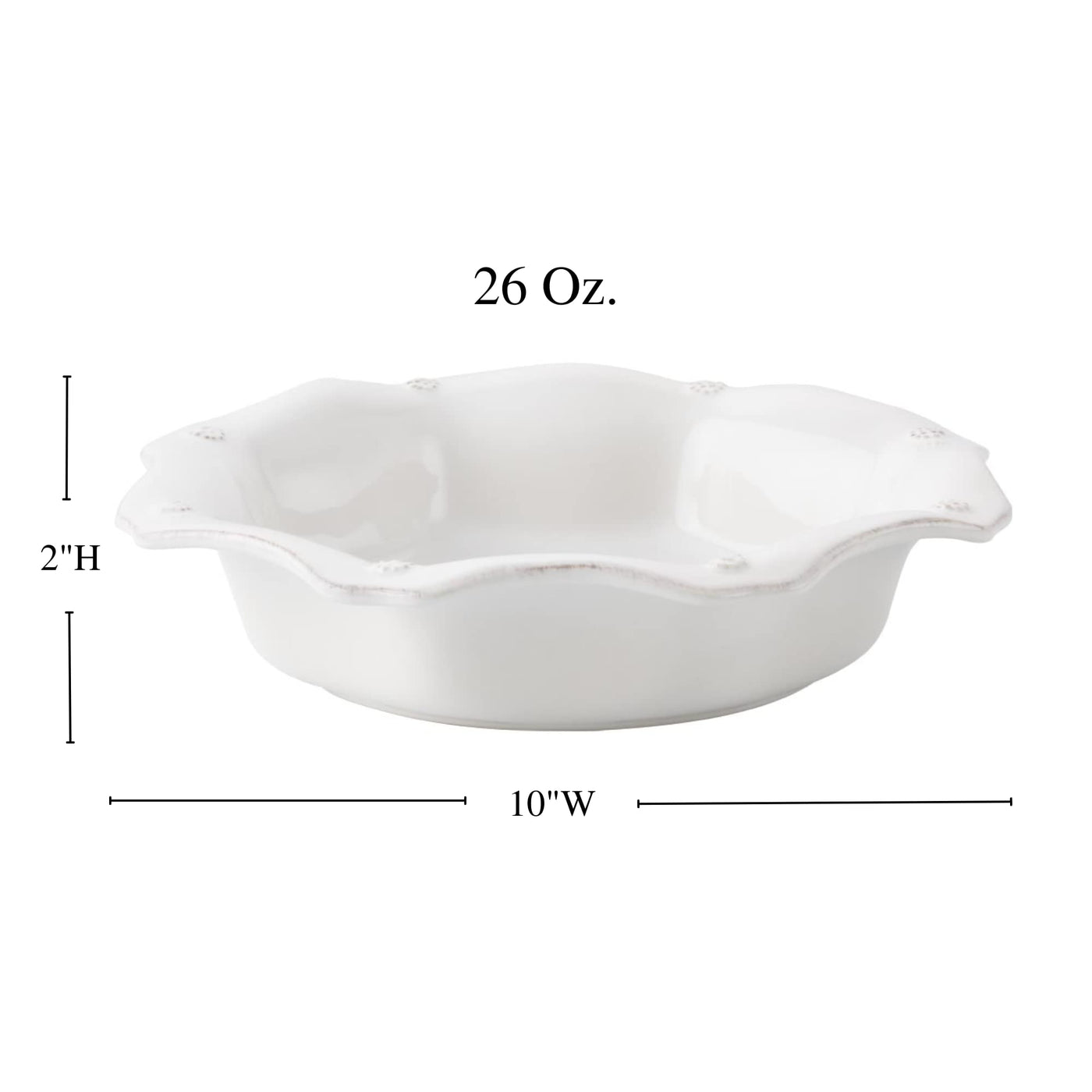 • Q: What is the size and capacity of the Juliska Berry & Thread Scallop Pasta bowl? A: The Juliska Berry & Thread Scallop Pasta bowl measures 10.0 inches in width, 2.0 inches in height, and 10.0 inches in length, with a capacity of 26 ounces.