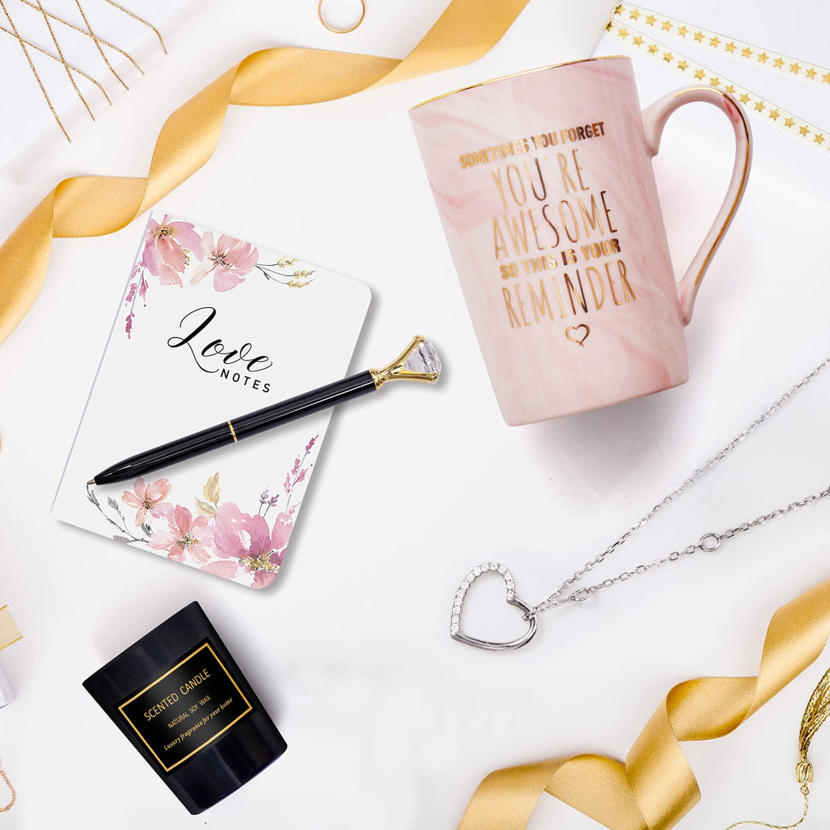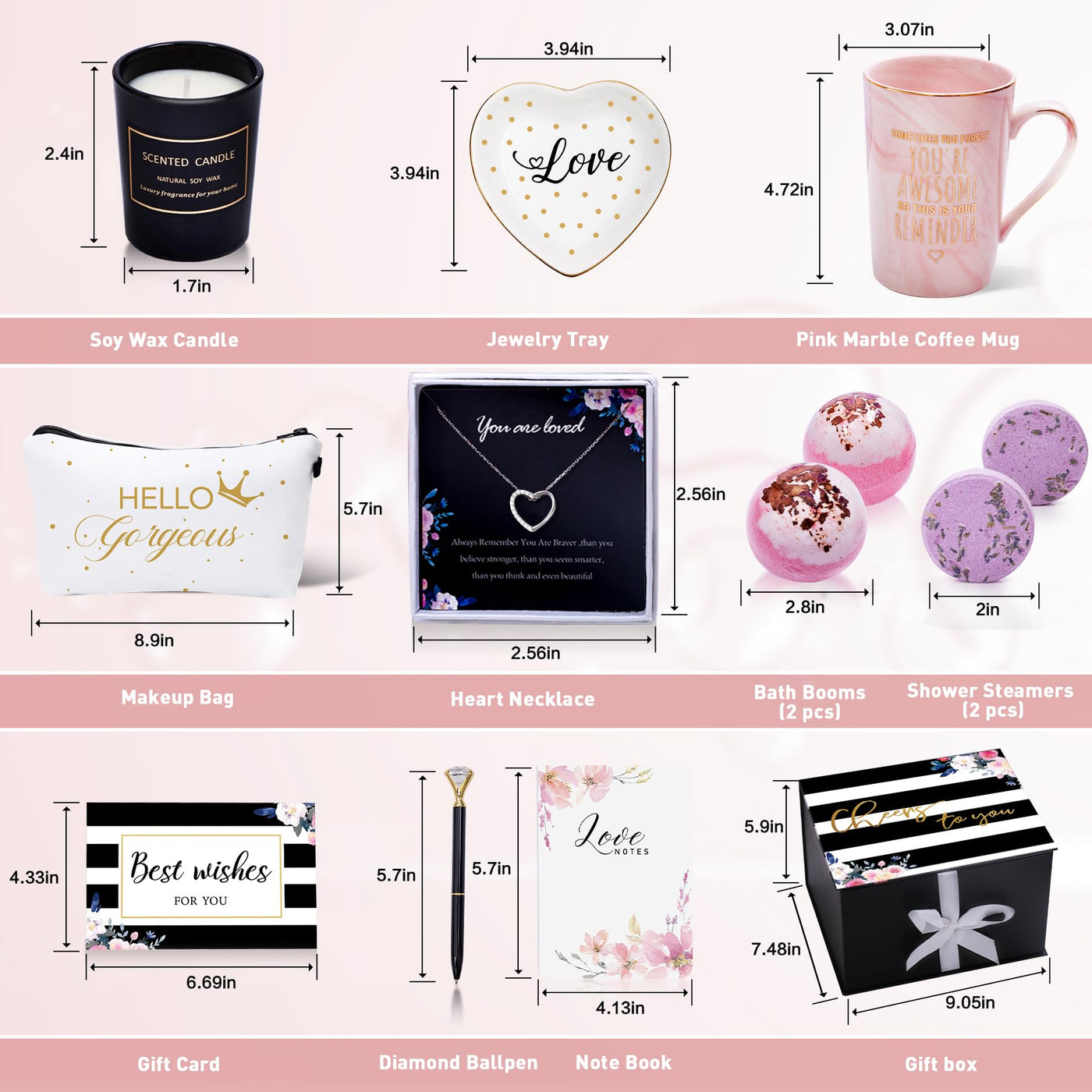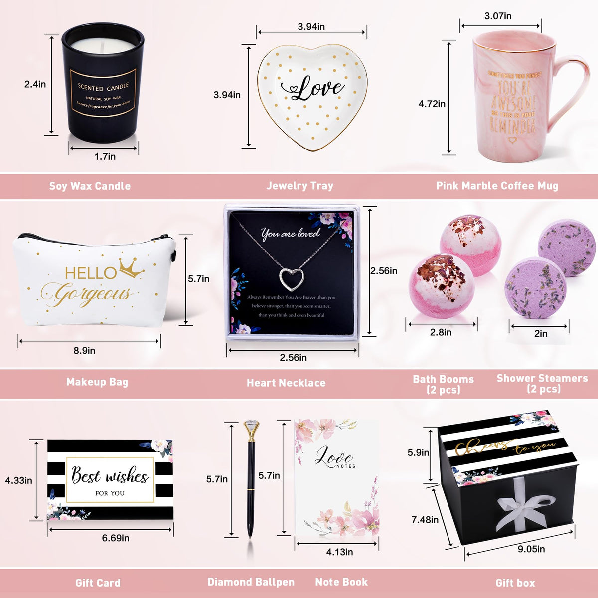 - Q: What items are included in the Jumway Birthday Gift Basket? A: The Jumway Birthday Gift Basket includes 11 unique items: a pink marble ceramic coffee mug, a heart-shaped jewelry tray, a silver heart-shaped necklace, a soy wax candle with English pear and freesia scent, two pink bath bombs with dried rose flowers, two purple shower steamers with dried lavender flowers, a cute-sized notebook, a black diamond head ball pen, a 'hello beautiful' cosmetic bag, and a greeting card.