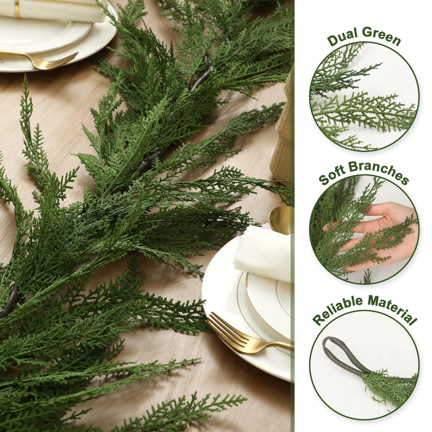 Features: Match with Other Decorative Elements: This cedar pine needle garland features a flexible structural design for easy shaping. It pairs beautifully with ornaments, bows, colorful lights, or other seasonal decorations to create personalized Christmas arrangements No maintenance required: Our artificial cedar pine garland is maintenance-free. Simply dust it after the holidays and store it properly - it will become your holiday embellishment and make you feel warm. Warm Tips: Upon receiving your cedar pine garland, if you desire more volume, gently unfold and fluff the branches to achieve a fuller appearance. Specifications: Material: artificial cedar pine needles Color: green Size: about 6 ft in length Package includes: 1 X Christmas cedar pine garland Note: Manual measurement, please allow slight errors in size. The color may exist a slight difference due to different screen displays.