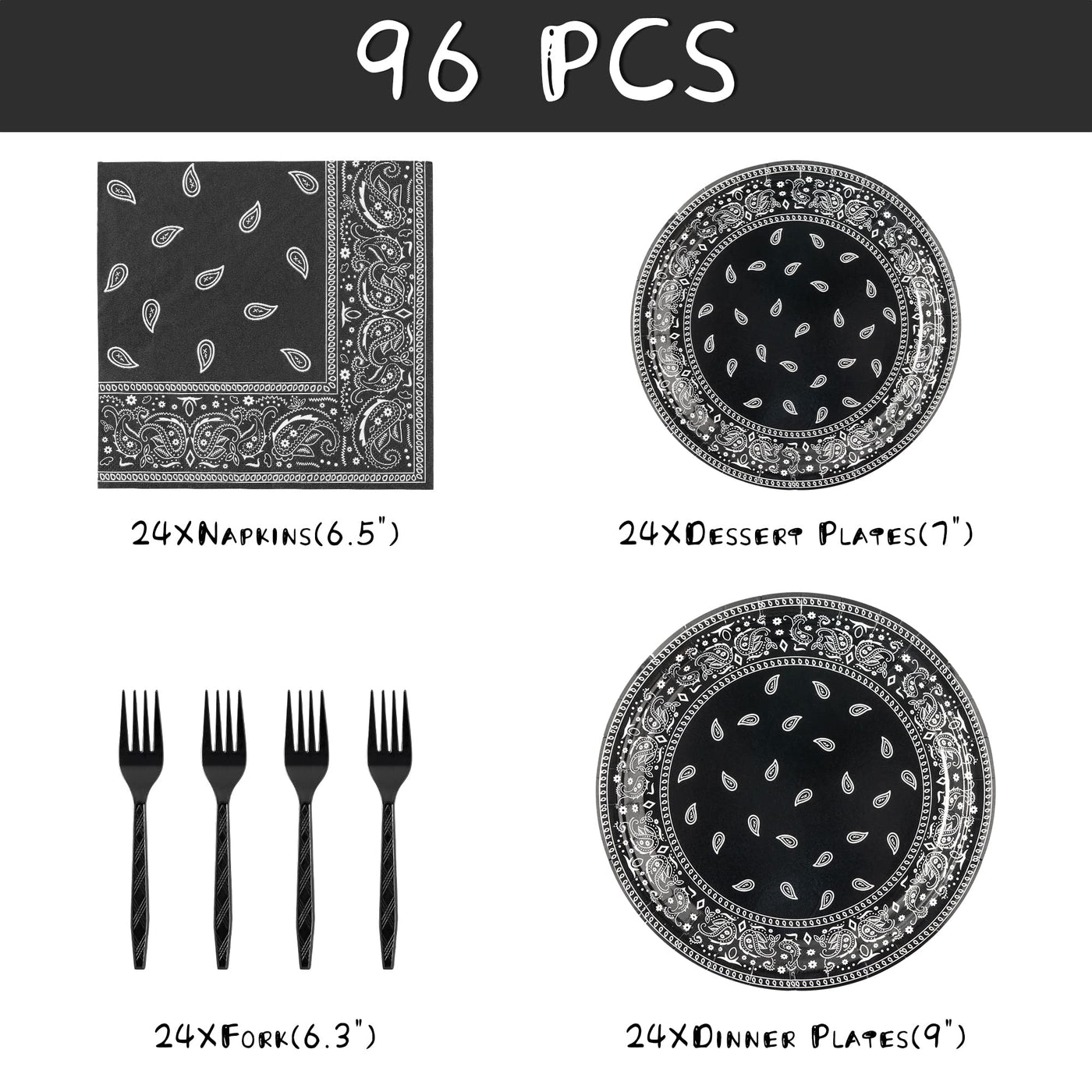 • Q: What is included in the K1tpde 96PCS Cholo Bandana Party Tableware Set? A: The set includes 96 pieces of tableware, consisting of paper plates, paper napkins, and plastic forks, all designed with a Cholo bandana theme.