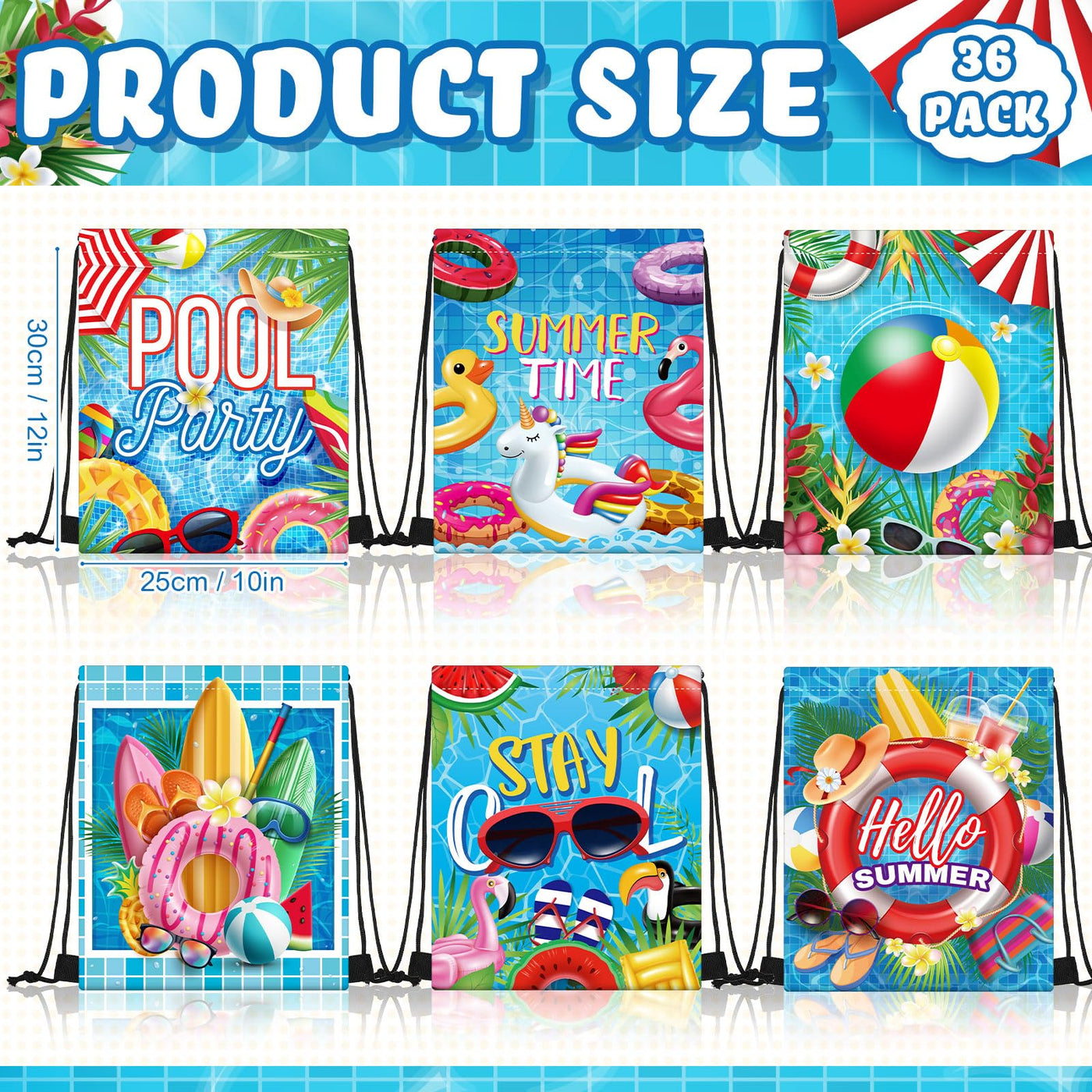 - Q: How many bags are included in the package? A: The package includes 36 pool party luau drawstring bags.