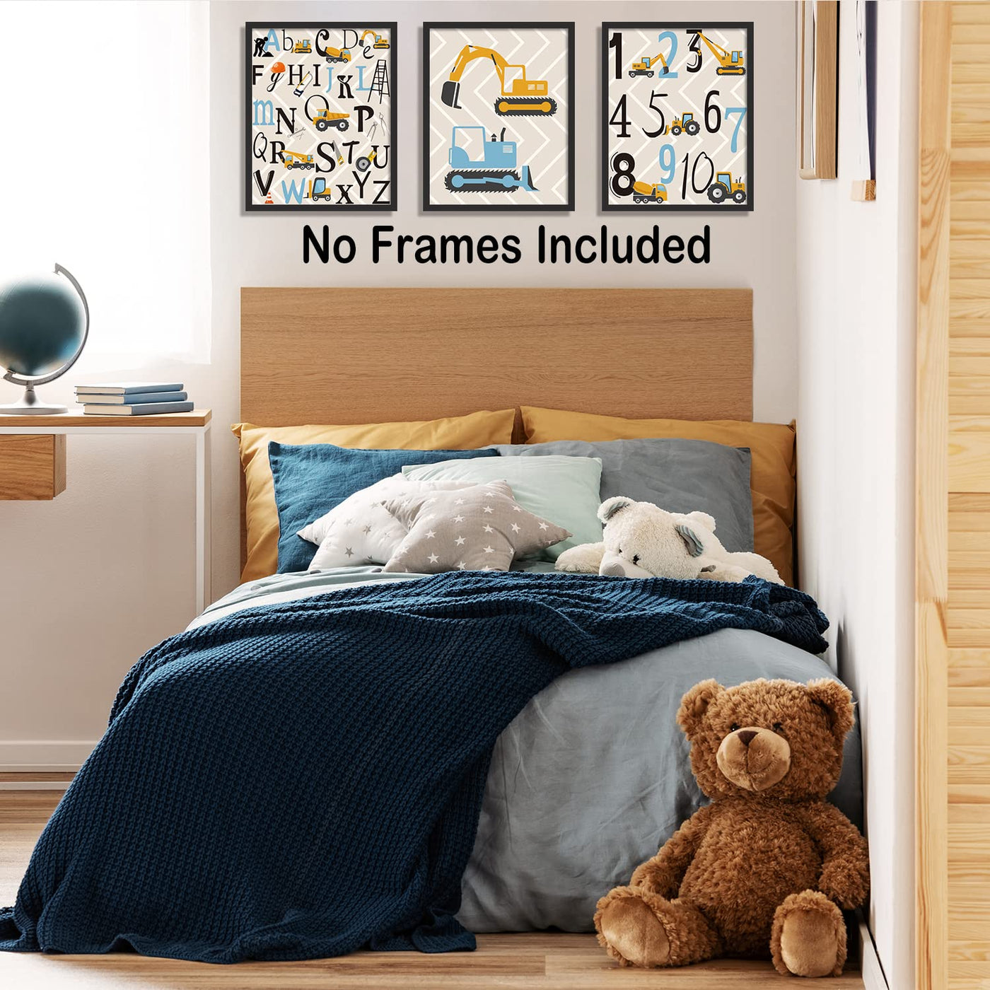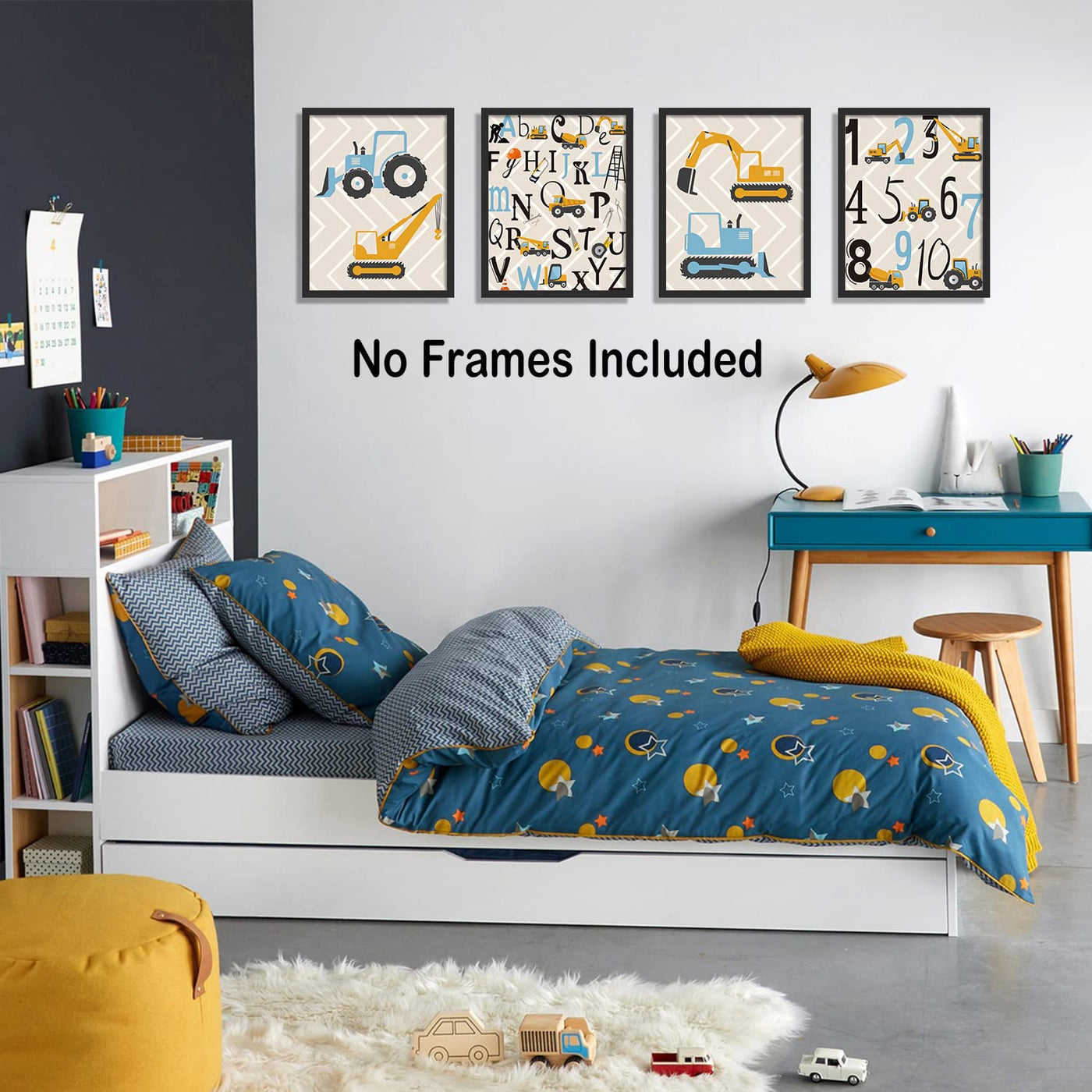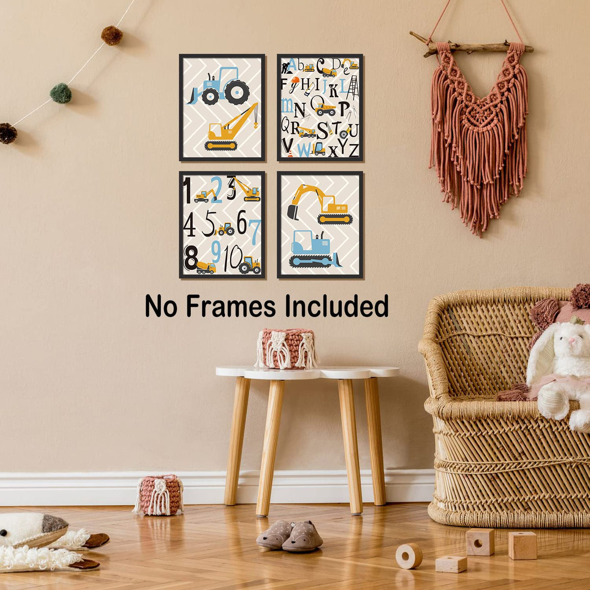 Kairne Cartoon Construction Art Print, Set Of 4 (8X10 ) Trucks,Digger,Transport Vehicle Canvas Poster,Alphabet Numbers Art Pai