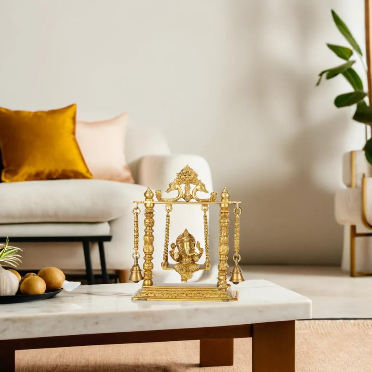 Kartique Brass Ganesh Jhula Idol on Swing - 10 Height, Antique Finish, Ideal for Home Decor, Puja, and Gifting