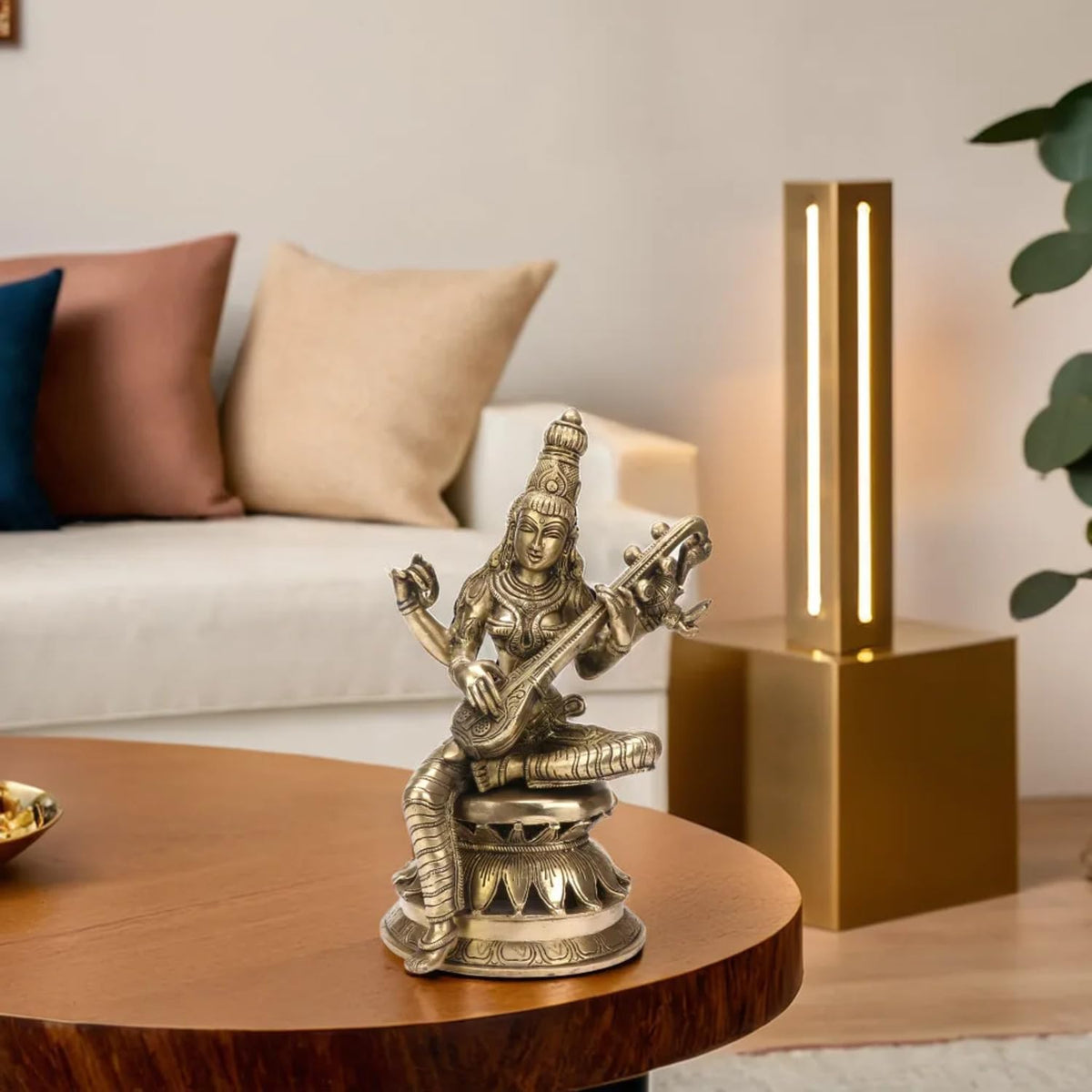 Kartique Brass Saraswati Idol With Veena, Antique Gold Finish, 12 Inches Height, For Home Decor, Pooja Room, And Gifts
