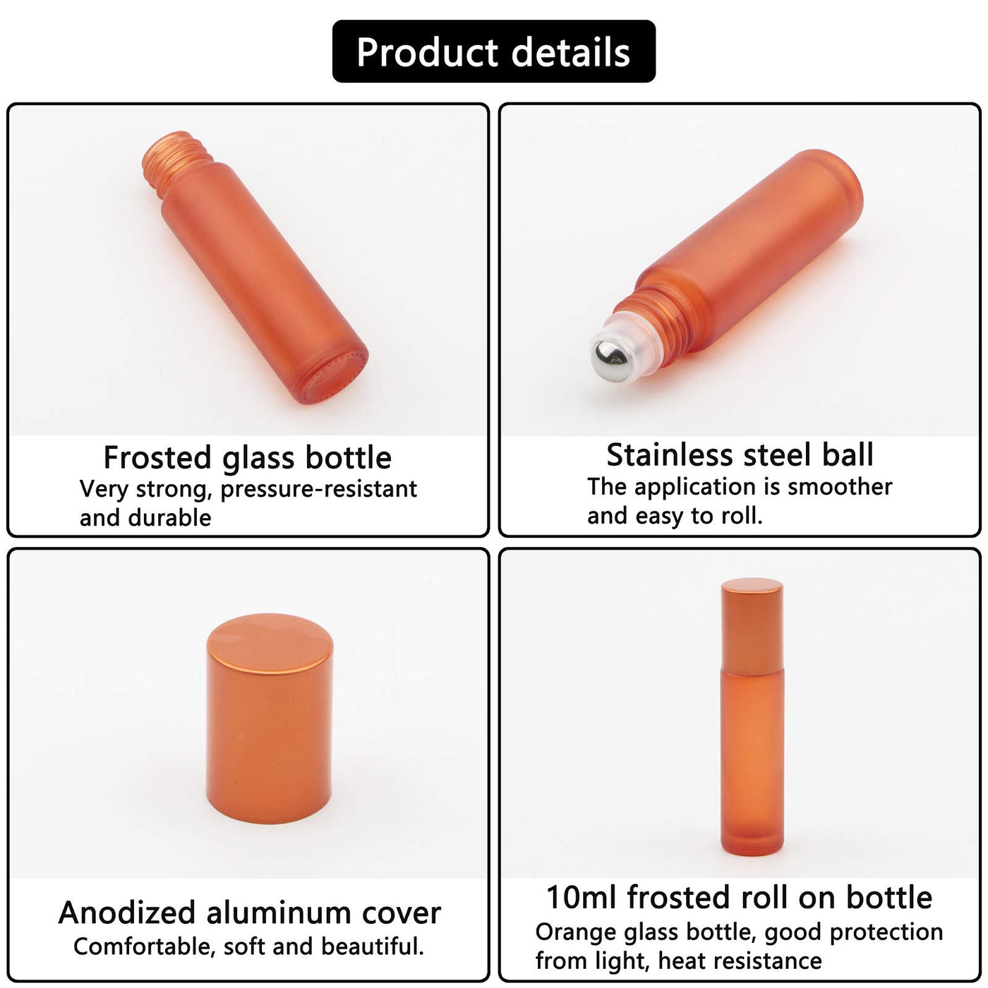 - Q: How many bottles are included in the package? A: The package includes 10 pieces of 10ml orange glass essential oil roller bottles.