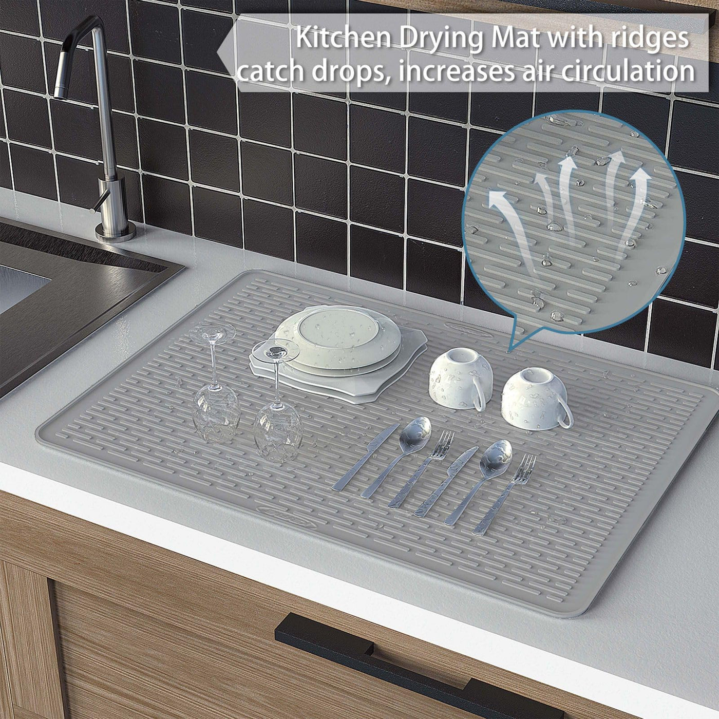 • Q: Does the silicone mat have any special features for ventilation? A: Yes, the silicone mat features wide raised line ridges that improve ventilation and air circulation, helping to dry dishes effectively.