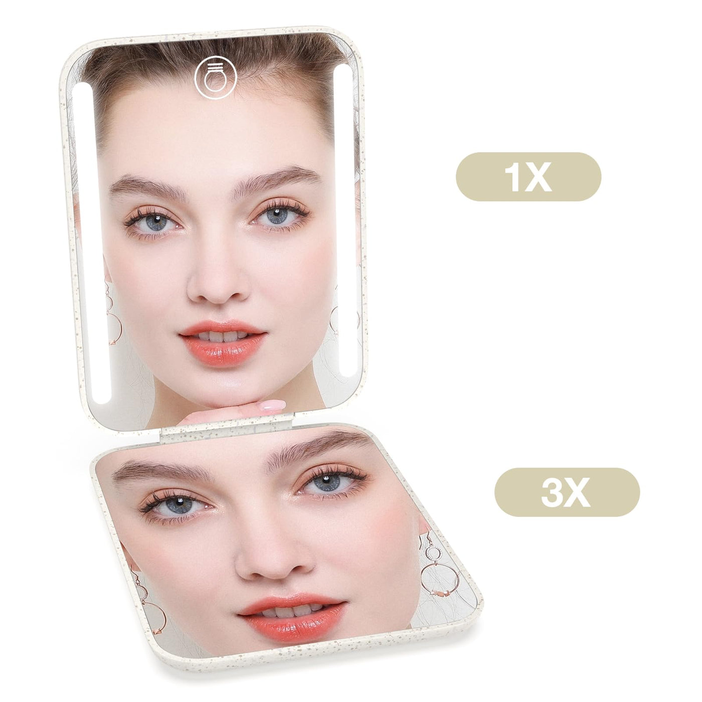 Kintion Rechargeable Pocket Mirror Wheat Straw Material 1X/3X Magnification Portable Compact Mirror Handheld Travel Mirror Small Purse Mirrors for Women Apricot