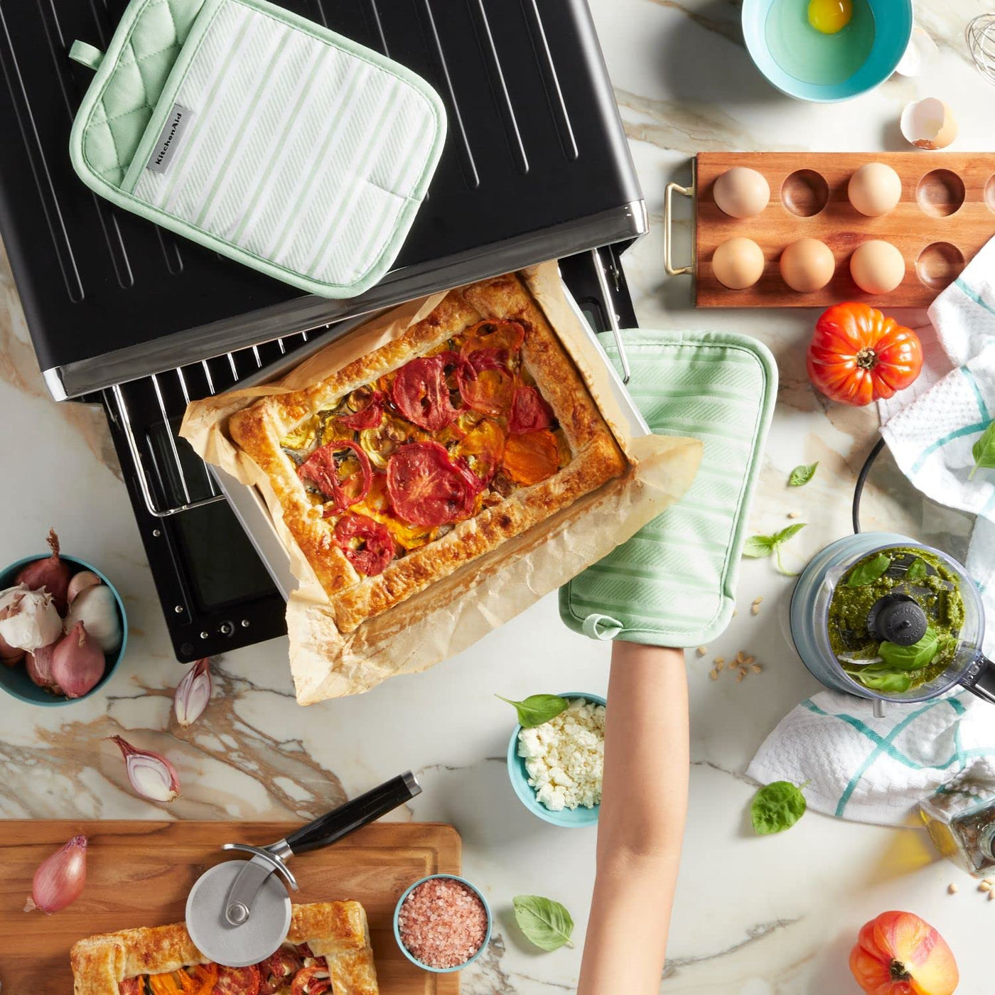 • Q: What color options are available for the KitchenAid Albany Pot Holders? A: This specific set is available in a pistachio color.