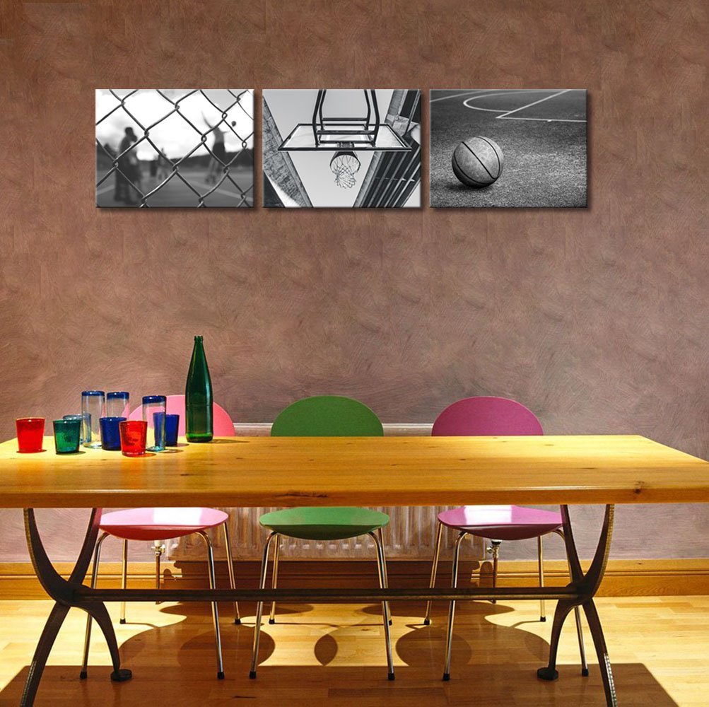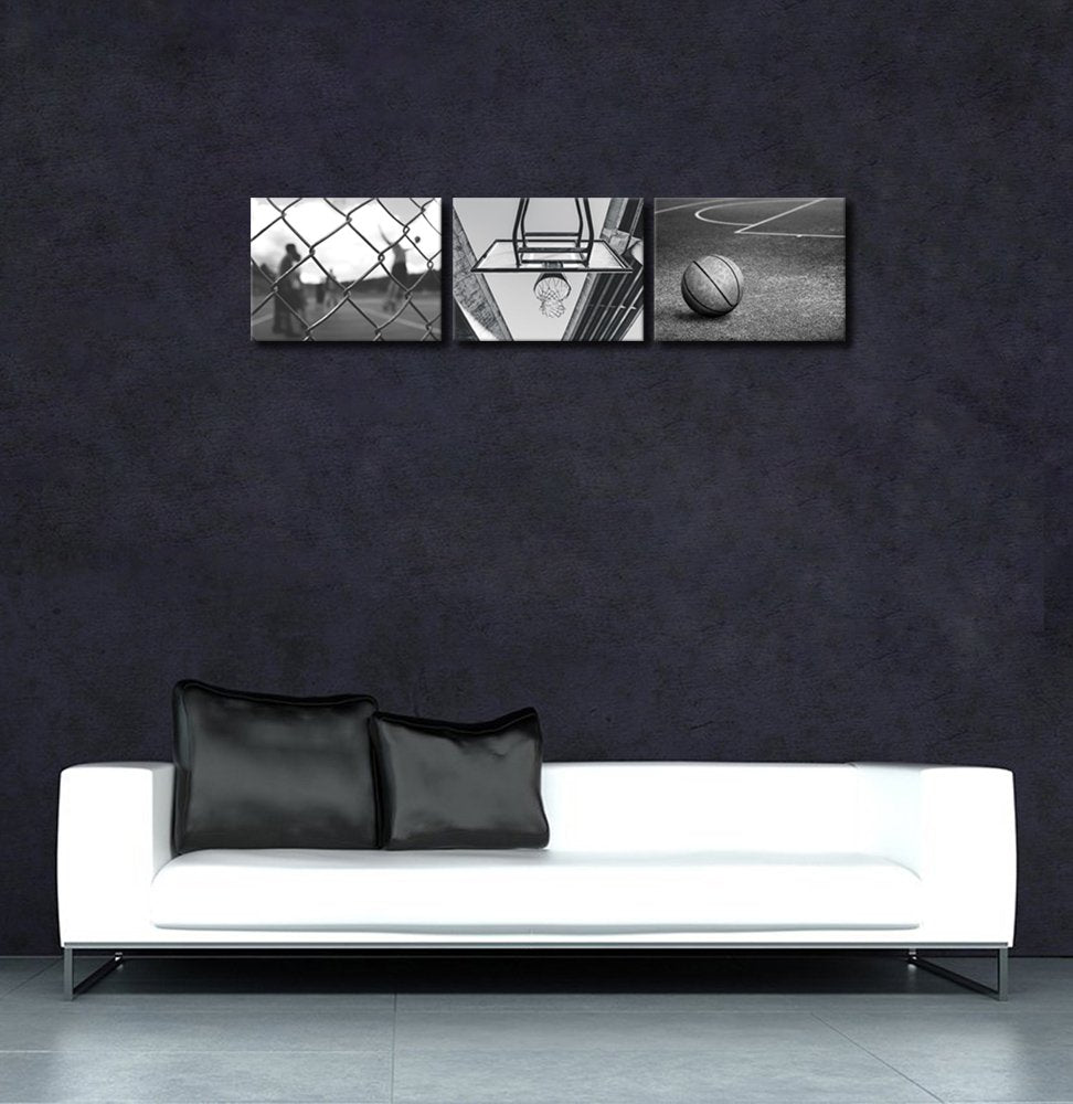 Klvos 3 Panels Black And White Wall Art Antique Basketball And Low Angle View Basketball Hoop Sport Canvas Art Modern Home Decor