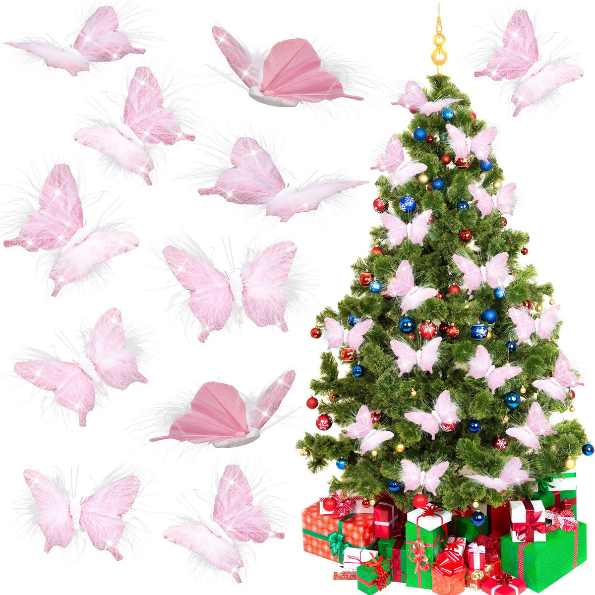 Knitgrip 24 Pcs Christmas Tree Glitter Butterflies Ornaments White Feather Butterfly with Glitters Clip on Artificial Butterflie