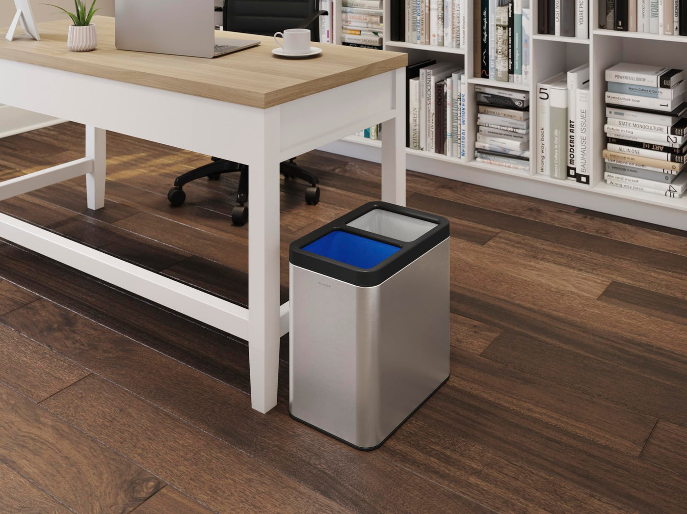 • Q: Is the trash can easy to use for separating recyclables? A: Yes, the dual 11-liter compartments allow for easy separation of trash and recyclables, promoting better waste management.