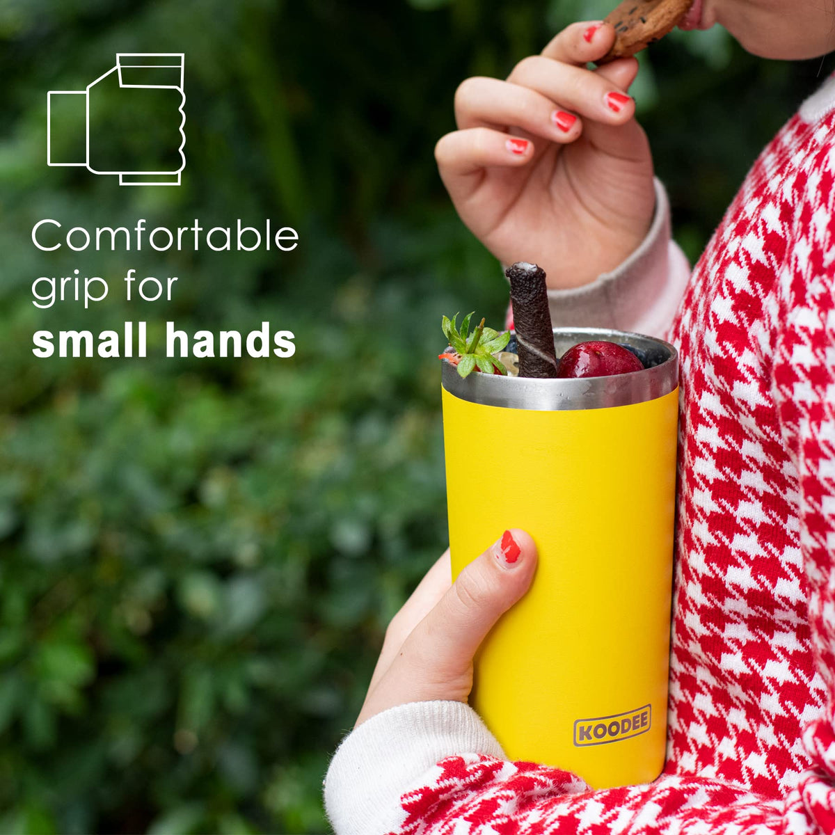 - Q: What is the design of the koodee tumbler like? A: The tumbler has a tapered appearance, making it easy to grip for small hands, enhancing usability.