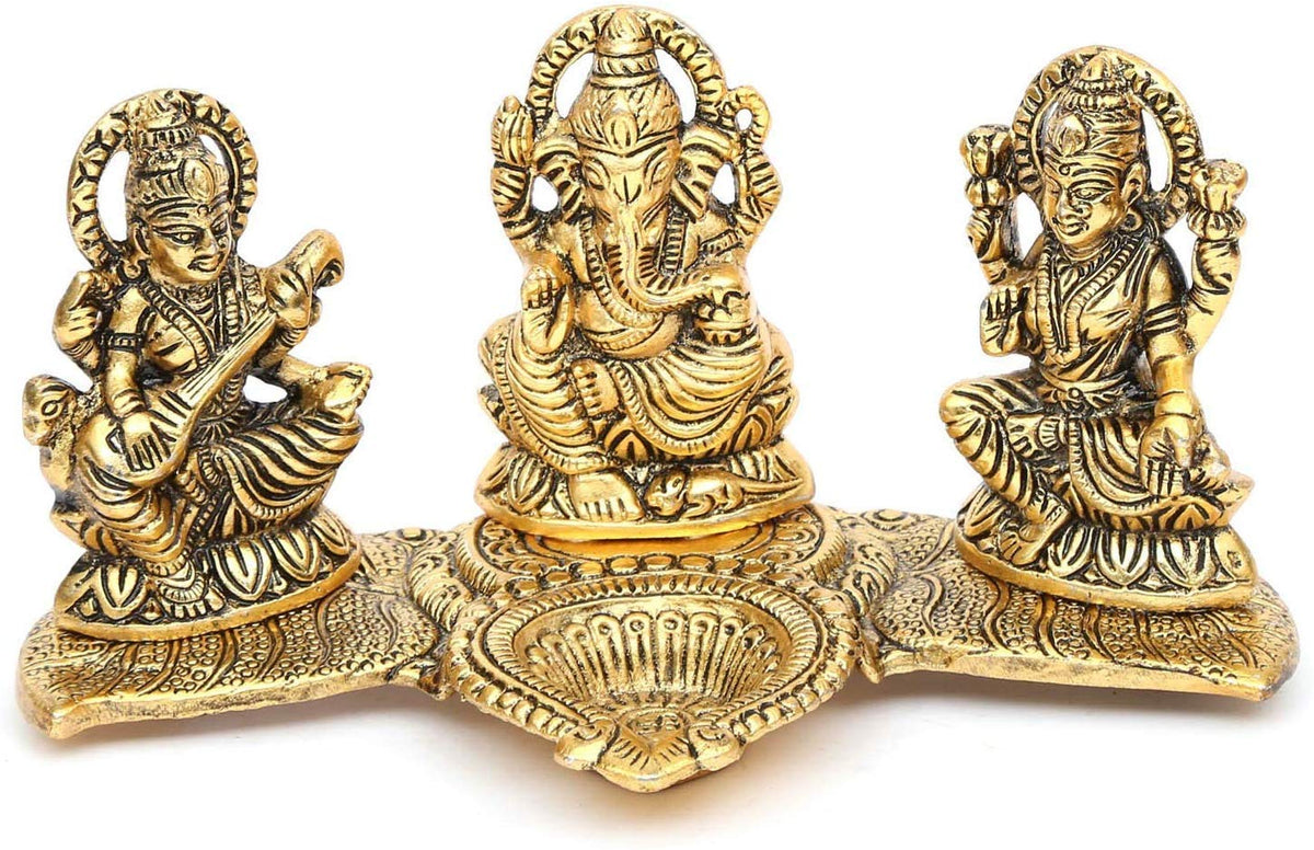 Kridaykraft Laxmi Ganesh Saraswati Idol Decorative Platter With Diya And Agarbatti Stand Perfect Diwali Gift For Pooja, Home Dc