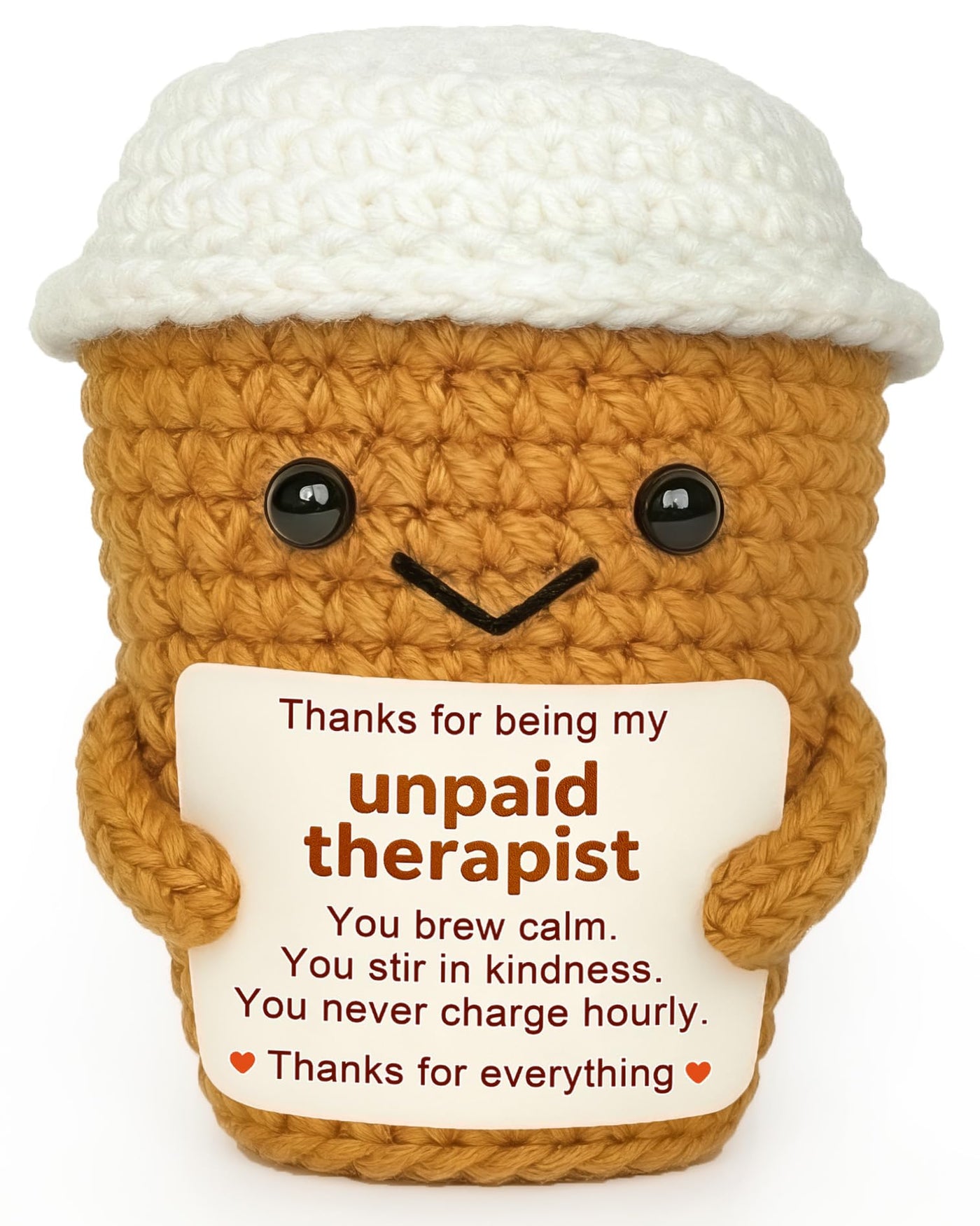 This handmade crochet coffee cup plush says thank you in a funny and heartfelt way, with the playful message: ?hanks for being my unpaid therapist. You brew calm. You stir in kindness. You never charge hourly. Thanks for everything.?/p> Best Friend and Bestie Gift Show appreciation to the friend who always listens. A perfect best friend gift or gift for bestie, it? a small but meaningful way to brighten their day. Coworker Appreciation Gift Coworkers often hear our rants and share our laughter. This makes a memorable coworker appreciation gift or coworker leaving gift, ideal for office farewells or thank-you moments. Funny Couple Gift Partners are often unpaid therapists too. A playful funny gift for boyfriend or girlfriend, or a lighthearted surprise for husband or wife who? always been patient and kind. Family Thank You Gift Great for siblings or parents who support you without hesitation. A unique way to say thanks to family who always make time for you. Coffee Lover Desk Decor With its espresso pun and cute design, this plush doubles as a coffee lover gift and fun desk accessory. Palm-sized and handmade, it adds charm to any shelf or workspace. Each plush is crocheted from soft yarn, making every piece one-of-a-kind. Whether for a bestie, coworker, partner, family member, or coffee enthusiast, this tiny gift blends humor, gratitude, and warmth into one thoughtful keepsake.