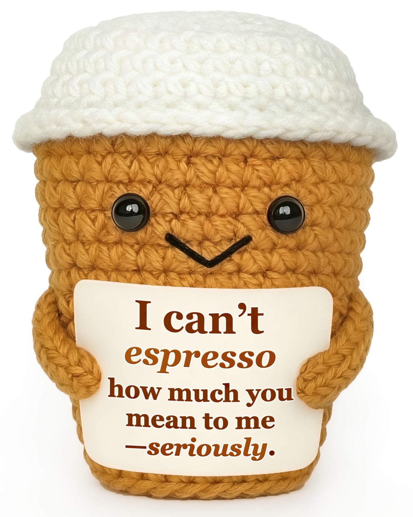 Love deserves to be celebrated in big and small ways.This handmade crochet coffee cup plush delivers a sweet and funny message:? can? espresso how much you mean to me - seriously.?br>Cute, meaningful, and one-of-a-kind, it? the perfect mix of humor and romance for birthdays, anniversaries, and holidays. Birthday Gift for CouplesLooking for something unique for your partner? special day? This plush is an adorable birthday gift for boyfriend or birthday gift for girlfriend. Palm-sized yet full of love, it? a little reminder of how much they mean to you. Anniversary Gift IdeasCelebrate milestones with a keepsake that fits every stage of love. Perfect as a 1 year anniversary gift for boyfriend, a 1 year anniversary gift for girlfriend, or even a 1st wedding anniversary gift for husband or wife. It also makes a sweet 2 year anniversary gift, a thoughtful 3rd wedding anniversary gift, or even a memorable 4th or 5th anniversary keepsake for couples. No matter which milestone you?e celebrating, this plush adds warmth and laughter. Valentine and Holiday SurpriseBeyond anniversaries, this crochet plush makes a heartfelt Valentine gift for him or her, a romantic I love you gift, or even a small Christmas stocking stuffer. It? a funny yet sentimental way to say I love you on special occasions. Coffee Lover Desk DecorWith its espresso pun and charming design, this plush doubles as a coffee lover gift and a cute desk accessory. Place it on a shelf, nightstand, or office desk as a daily reminder of love. Handmade with LoveEach plush is crocheted from soft yarn, making every piece unique. Compact and cozy, it? a truly handmade gift that blends humor, romance, and heartfelt sentiment - ready to brighten someone? day. Celebrate your partner with a gift that? small, funny, and unforgettable. From birthdays to anniversaries - whether it? the 1st, 2nd, 3rd, 4th, or 5th anniversary - this crochet coffee cup plush is the cutest way to say you mean everything