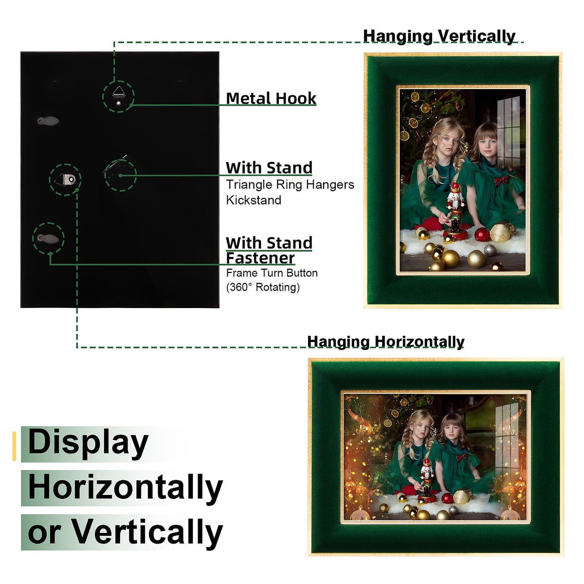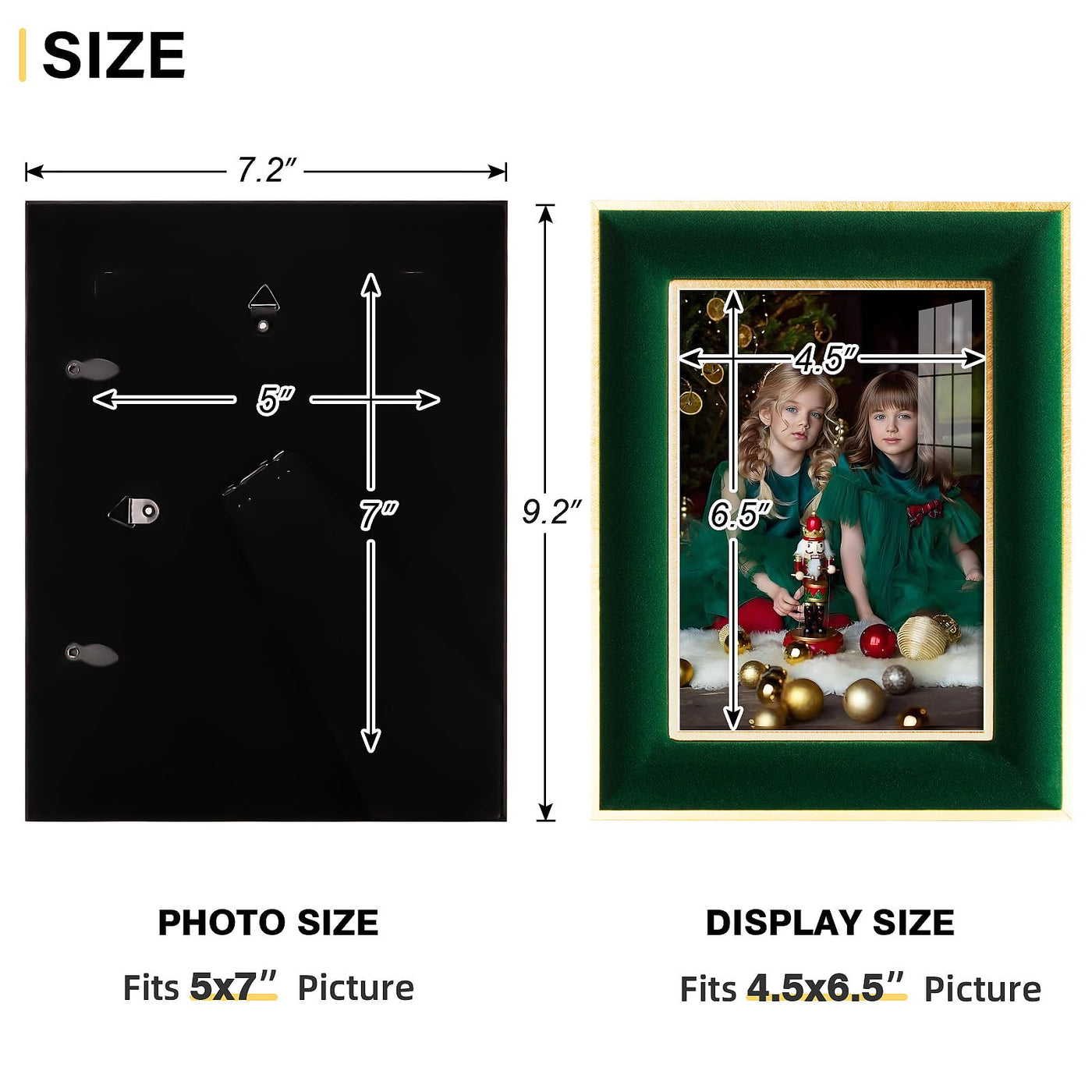 KSROECUD 5x7 Velvet Picture Frame, Green Photo Frames with Modern Simple Metallic Gold Border, HD Real Glass Horizontal & Vertic
