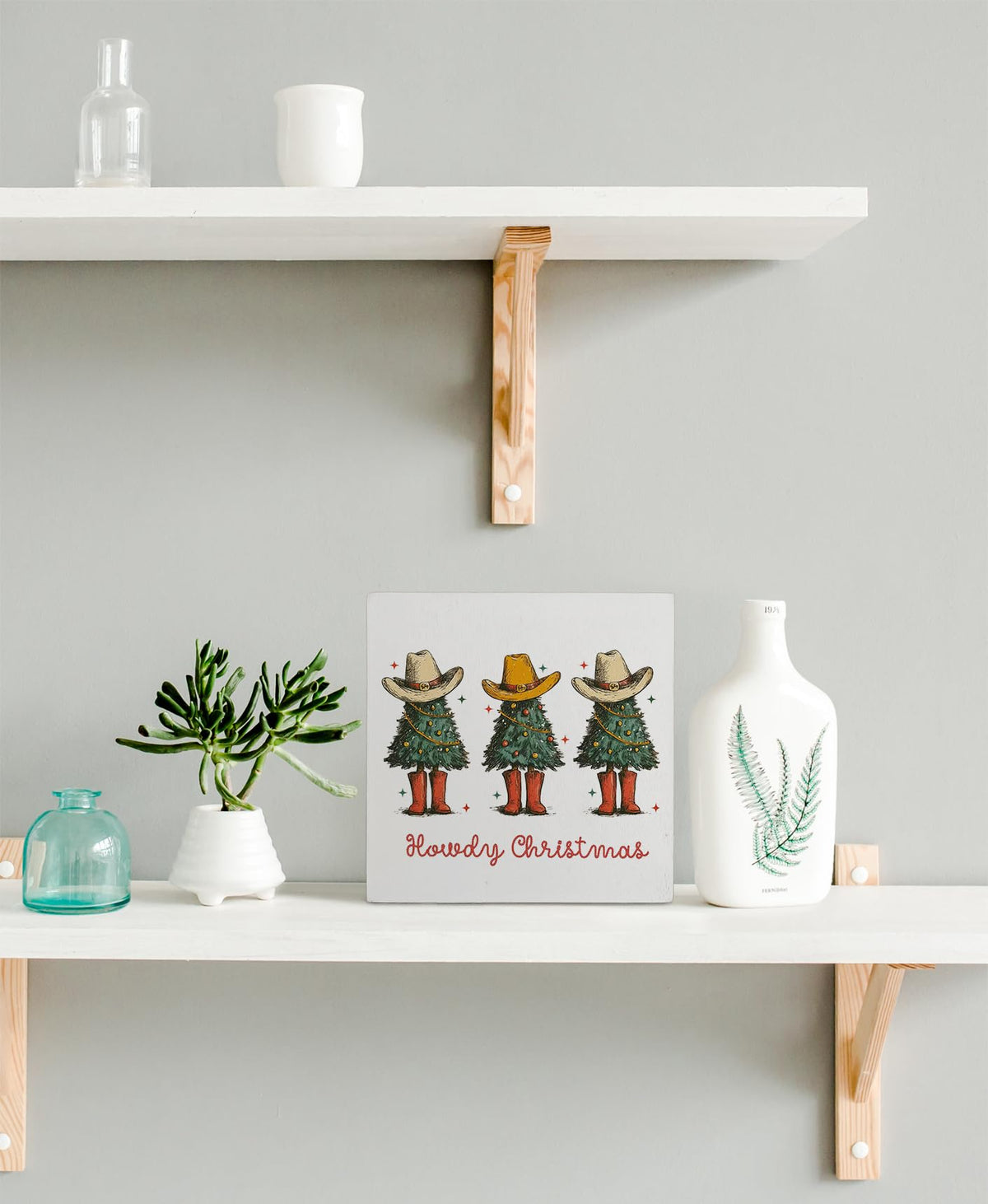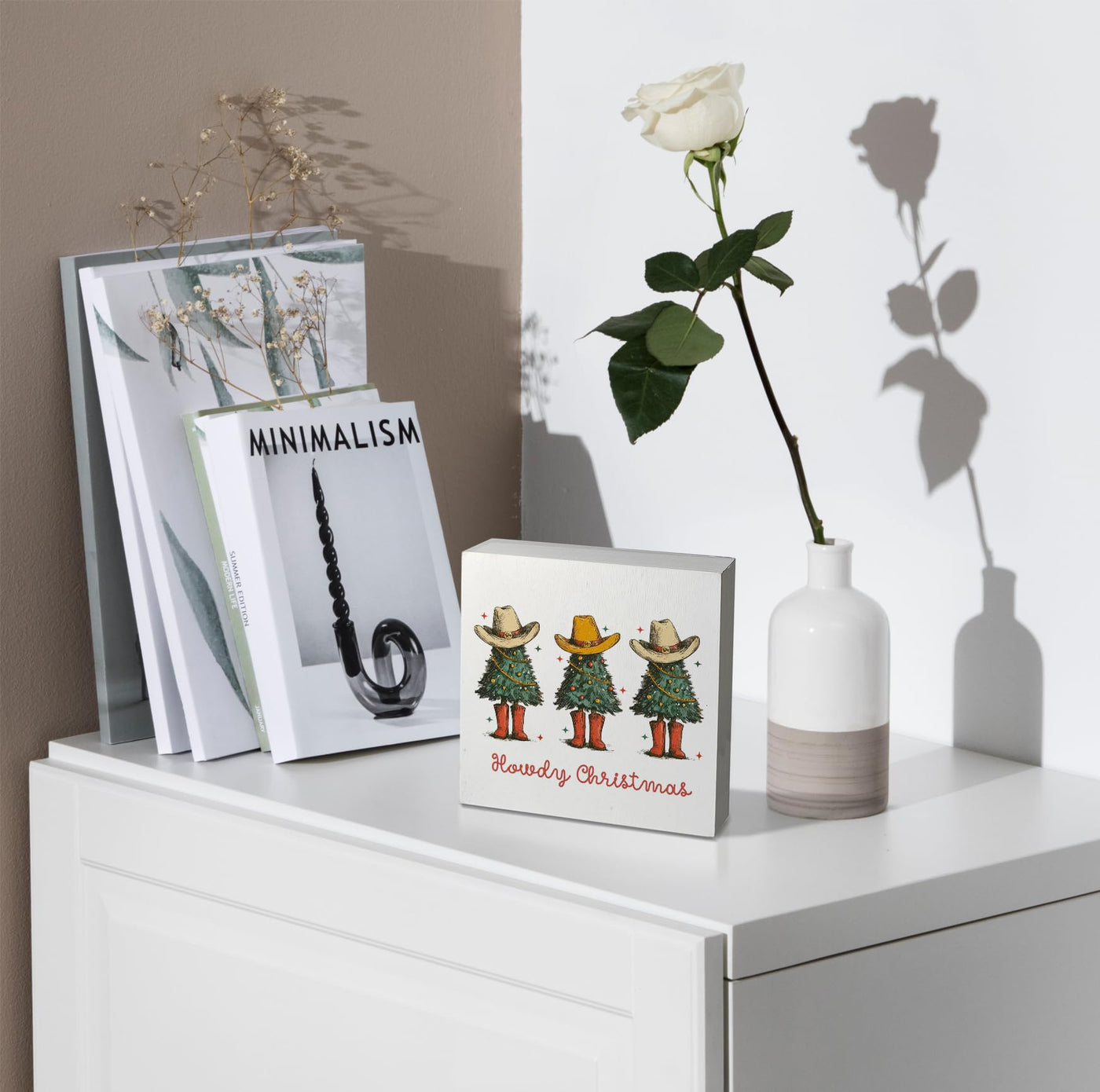 kunlisa Howdy Western Christmas Tree Wooden Sign, Christmas Cowboy Decor, Xmas Tree Southwestern Boots Holiday Wood Box Sign for