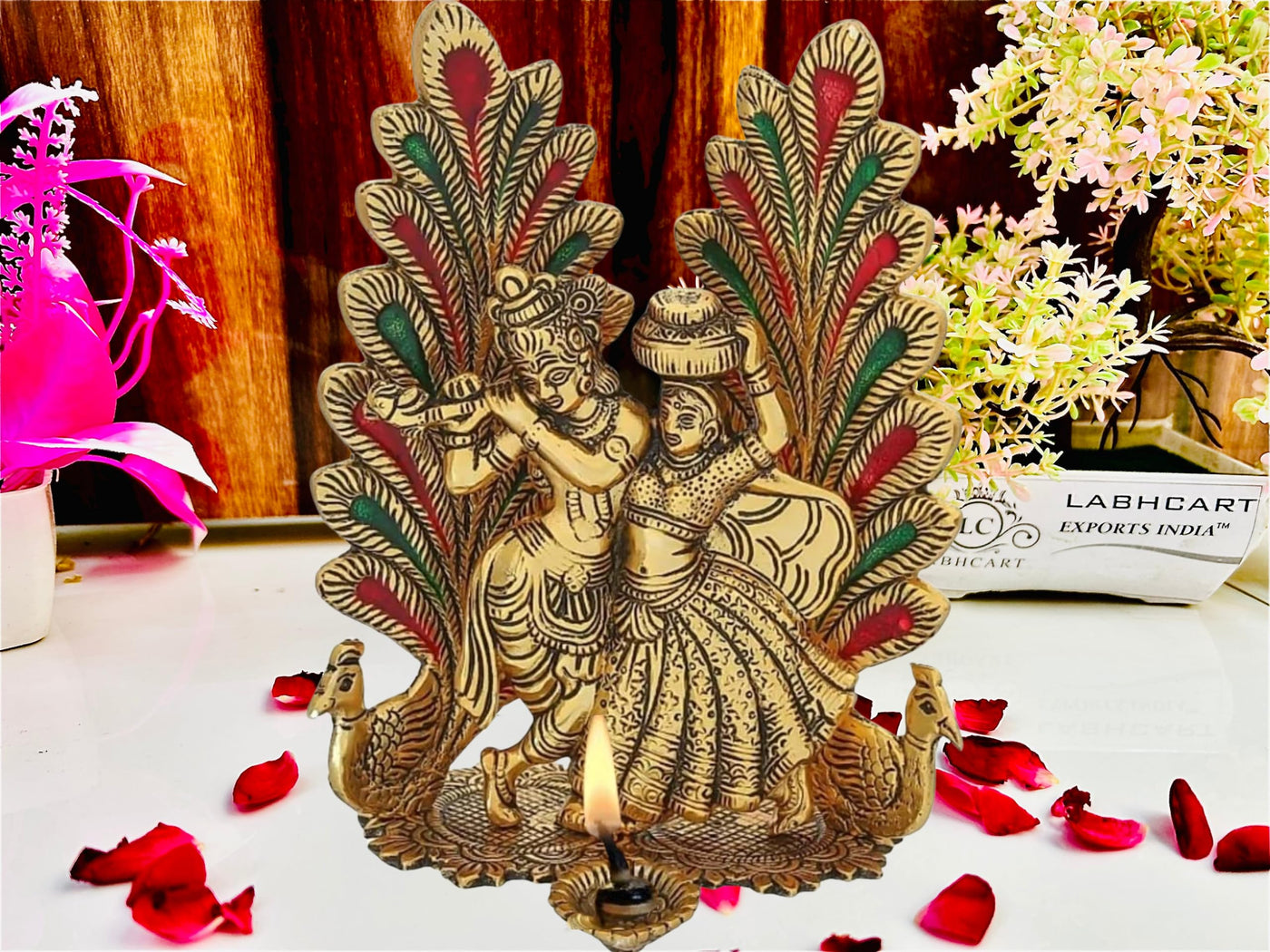 LABHCART Metal Radha Krishna Idol Statue with Diya Peacock Design Decorative Showpiece (Metal, Gold)